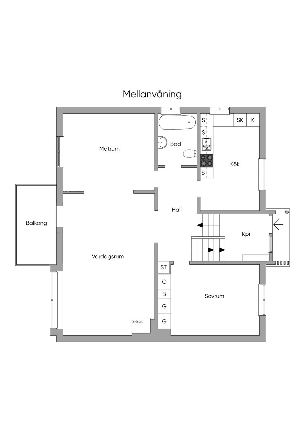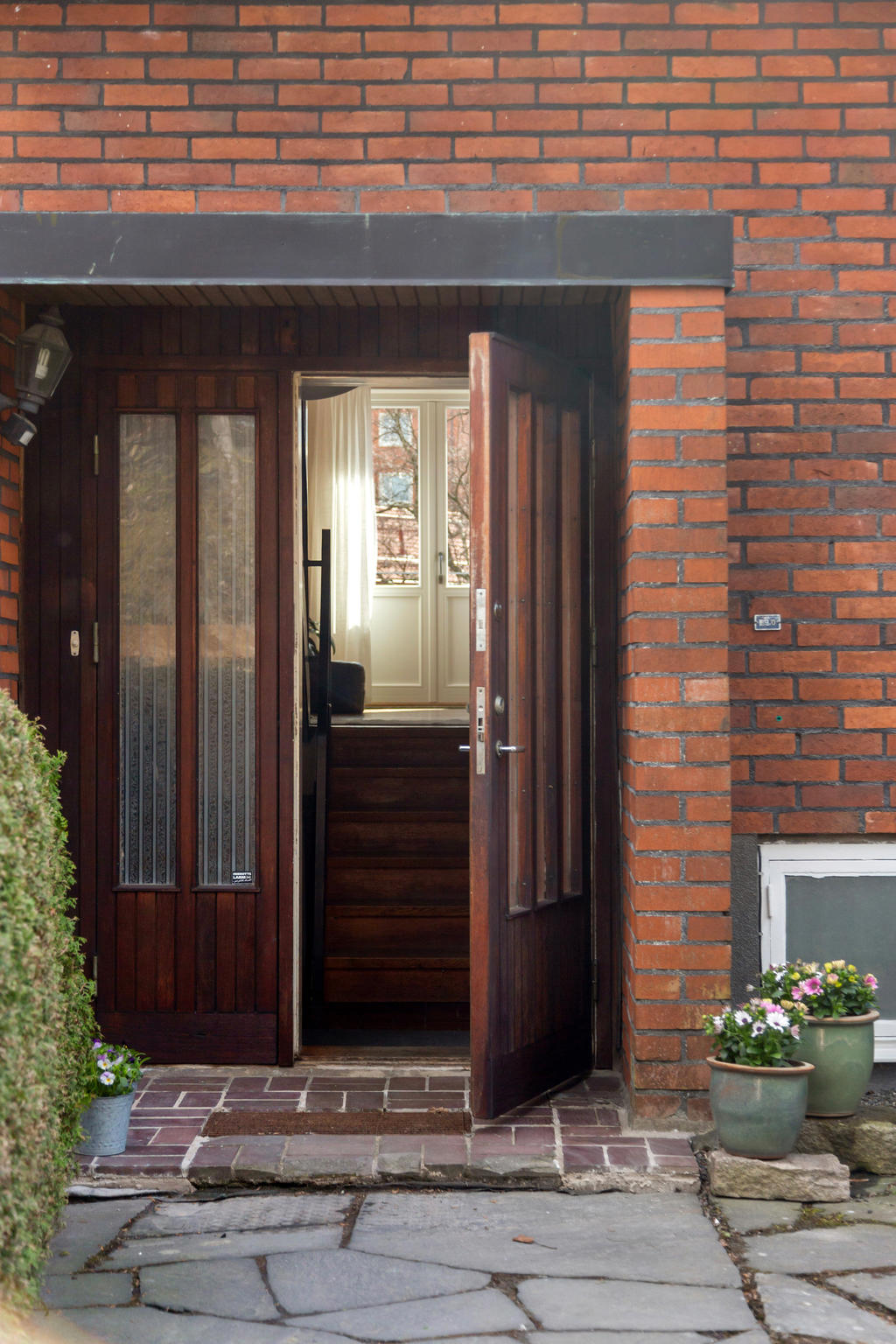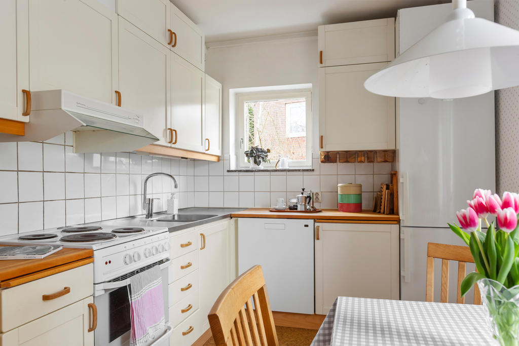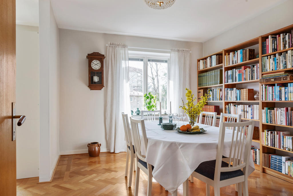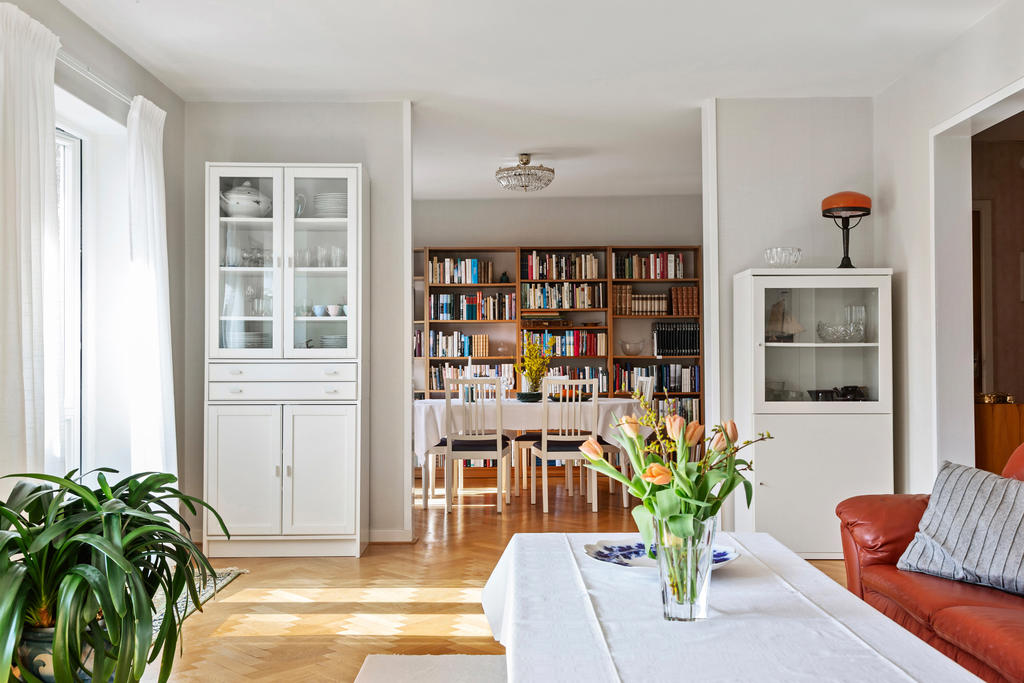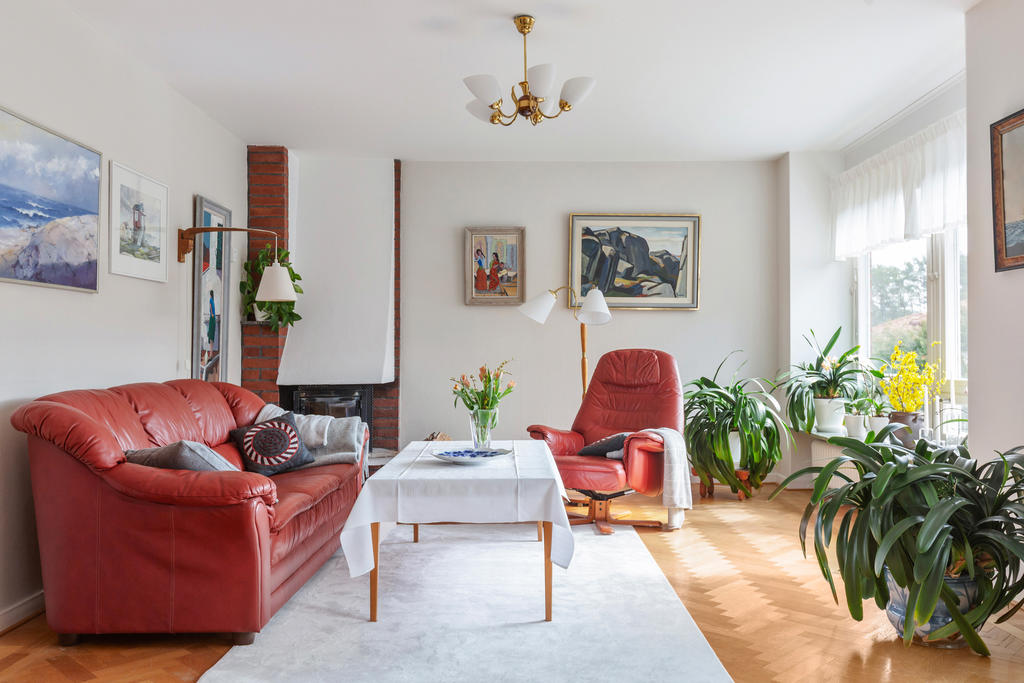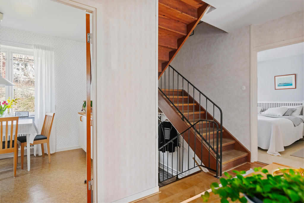 Redan vid entrén möts du av husets själ. Den glasade teakdörren öppnar upp till en välkomnande hall där trappan med smitt räcke leder dig vidare upp i bostaden. Här uppe breder ett ljust och luftigt vardagsrum ut sig, där stora fönster med djupa fönsterbänkar i marmor låter ljuset flöda fritt och skapar en harmonisk atmosfär. Den murade spisen, varsamt uppdaterad med braskassett, blir en naturlig samlingspunkt under årets kallare månader – en plats för stilla kvällar och sprakande eld.