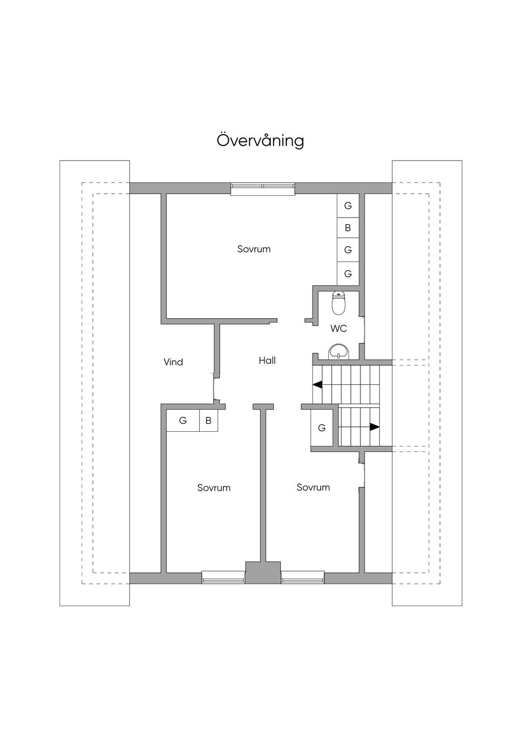 Huset rymmer totalt fem sovrum fördelade över tre plan. På entréplanet finns ett rymligt sovrum med gott om förvaring. En trappa upp väntar ytterligare tre sovrum, varav det större har egen vädringsbalkong – en stillsam plats att börja dagen på. Här finns också bra förvaringsmöjligheter via garderober och vindsutrymmen.