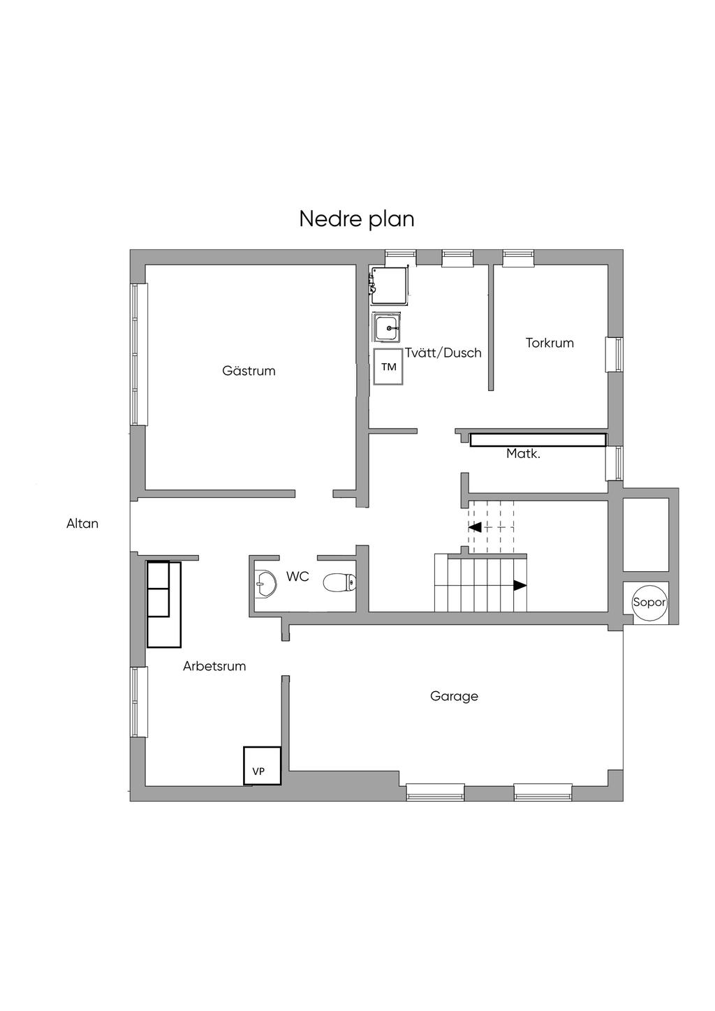 I suterrängplanet öppnar sig nya möjligheter. Här finns ett stort sovrum med egen ingång från altanen – idealiskt för tonåringen, gästrum eller uthyrning. Det tidigare pannrummet har med tiden fått flera funktioner, från kontor till hobbyrum, och kan enkelt anpassas efter behov. Tvättstugan är rymlig och praktisk, med dusch och goda möjligheter till både inomhus- och utomhustorkning.