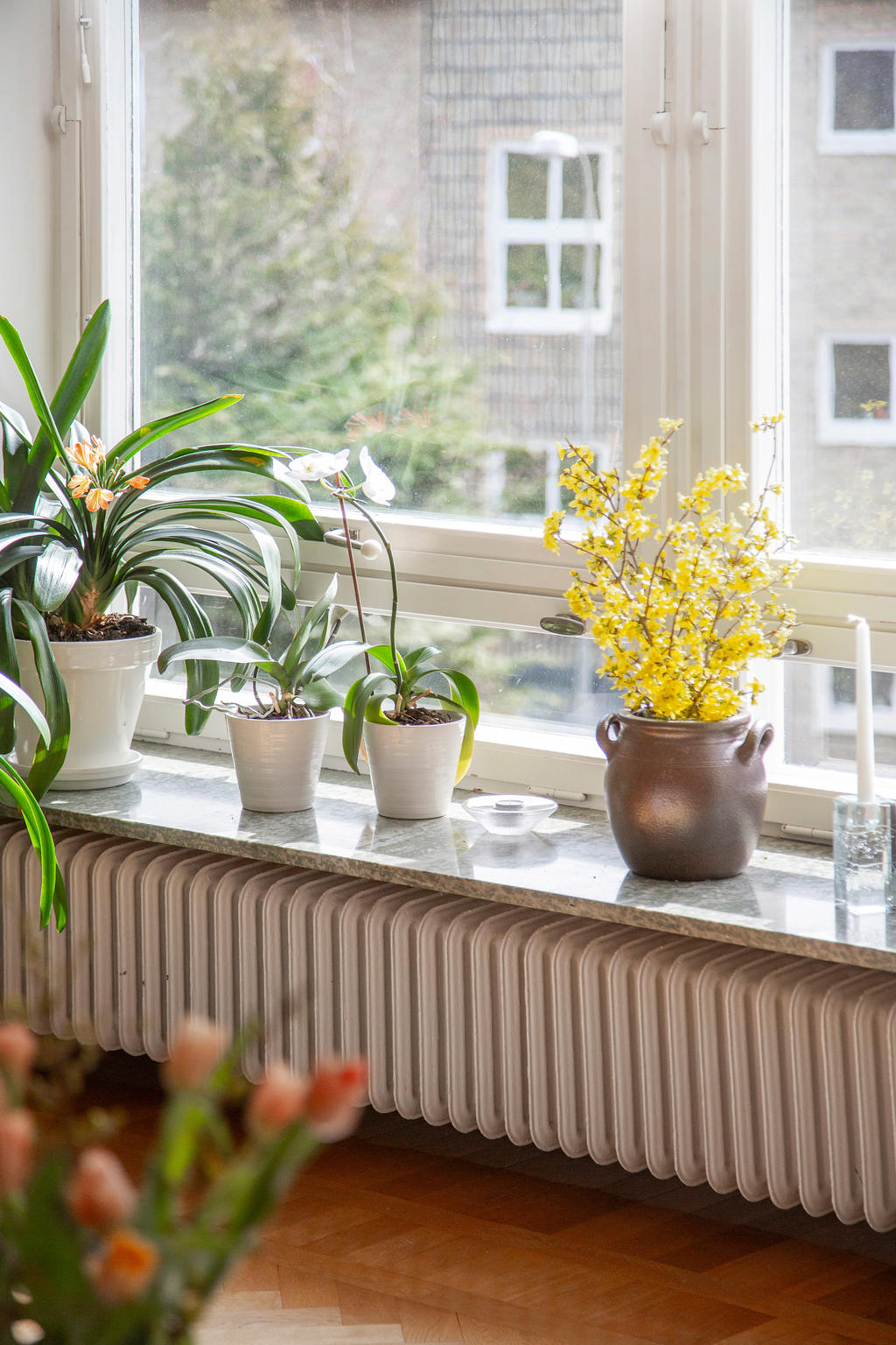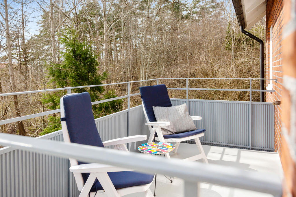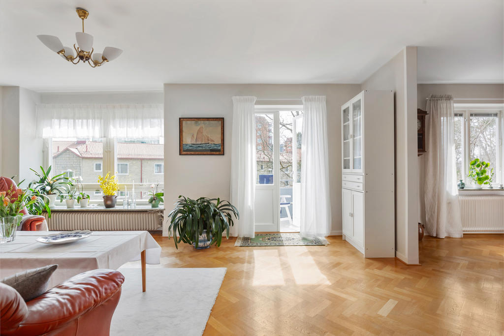 Via breda dubbeldörrar når du den rymliga balkongen i högt, soligt söderläge. Här får du ett privat utrymme att njuta av dagens alla soltimmar, med utsikt över grönska som skiftar med årstiderna.