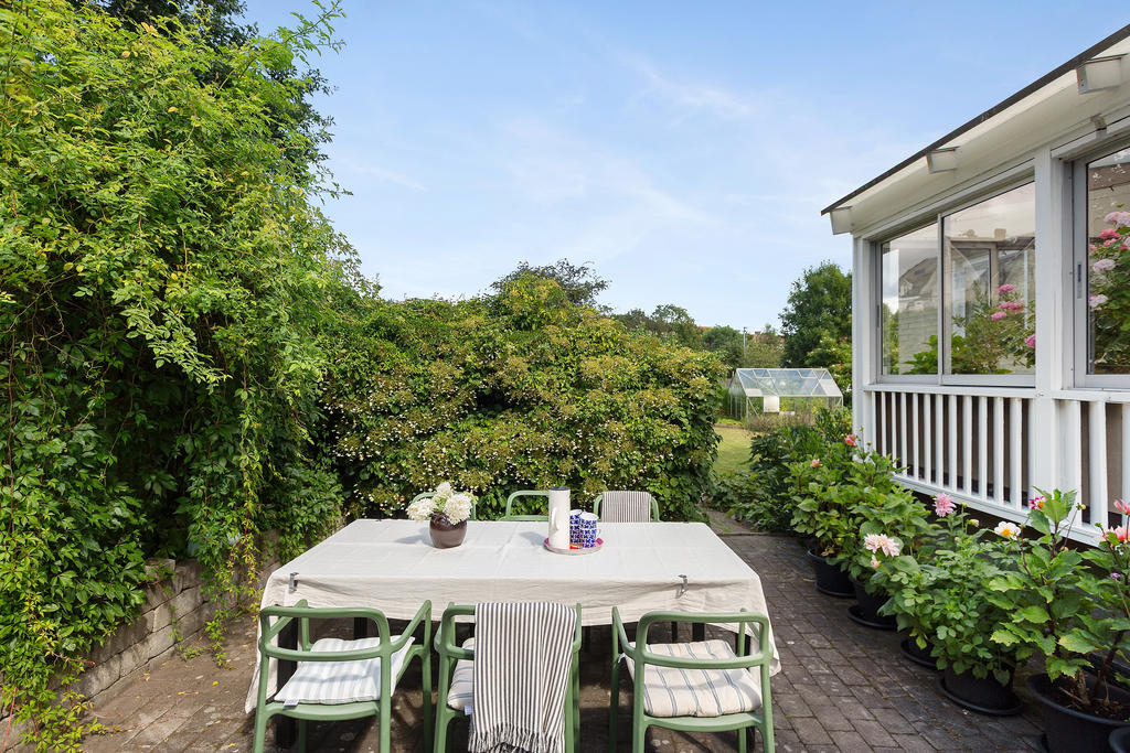 Det inglasade uterummet är vår favoritplats nästan året runt – perfekt för frukost på våren, middagar på sommaren och mysiga kvällar under hösten. Tomten är stor och välplanerad, med flera uteplatser som gör att man alltid kan hitta en solig eller skuggig plats. För barnen har det funnits gott om ytor att leka på, springa av sig eller spela fotboll.