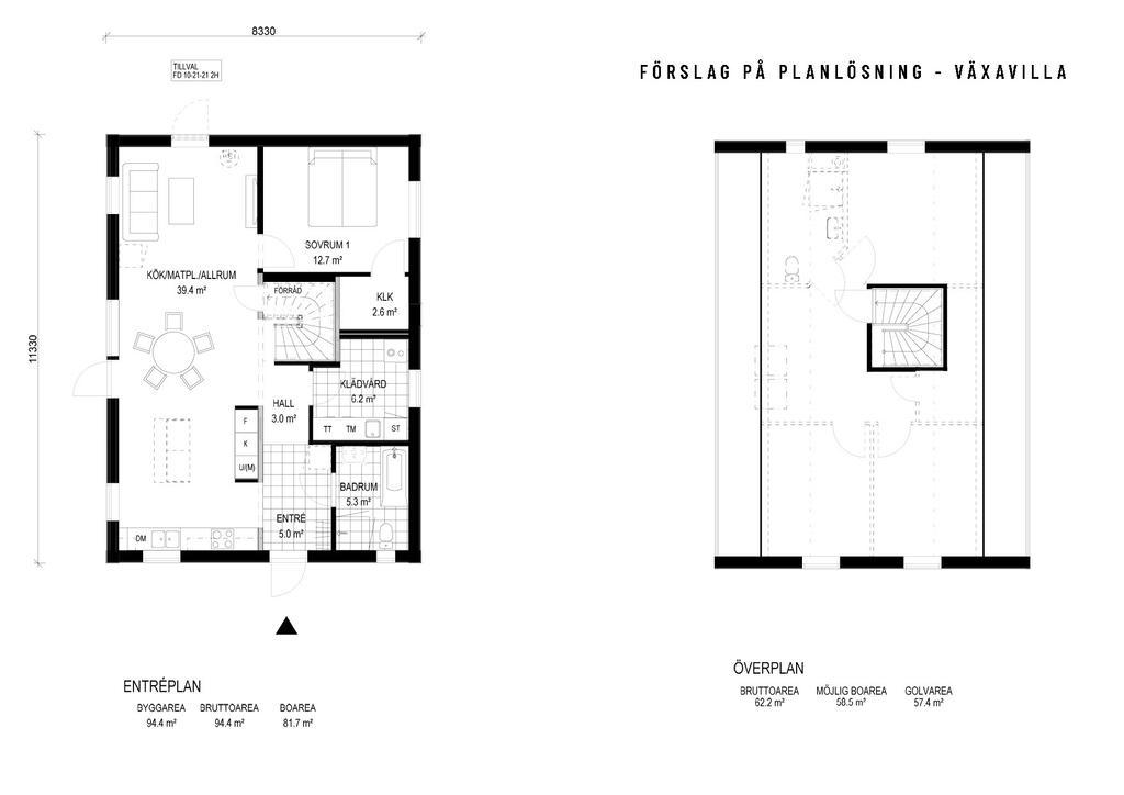 På Månskenvägen 12 som har en fantastisk utsikt och riktigt bra solläge kommer Villa Talludden att uppföras. Detta är ett riktigt fint 1 1/2-planshus med ett ljust och härligt vardagsrum och gott om plats för att leva. Ljuset från det härligt stora vardagsrummet möter dig redan i entrén. Du lastar smidigt in matkassarna rakt in i köket utan att behöva ta av dig skorna. På andra sidan har du badrummet – praktiskt när du vill tvätta av barnen innan de kommer in i huset. Huset är som gjort för härliga sommardagar, med helglasade dörrar till trädgården. Övervåningen levereras som förberedd, vilket innebär att det ingår alltid trappa, fönster, underlagsgolv, isolering och förberedelser för vvs, el och data (se på tilltänkt disposition på planlösning). På Månskensvägen 12 har man även chans att göra tillval för carport med förråd.