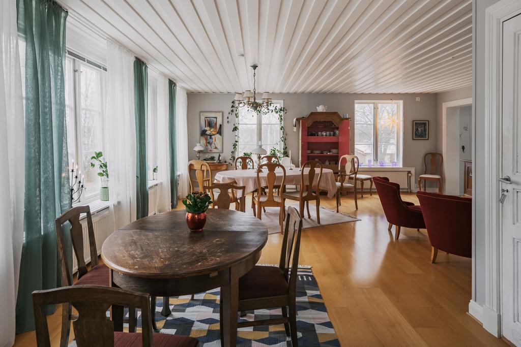 Husets planlösning är flexibel och genomtänkt med sex sovrum och stora sällskapsytor som bjuder in till samvaro. Ljusa färger, naturliga material och väl tilltagen takhöjd ger rymd och ett härligt ljusflöde. Här finns plats för både familj och gäster, eller kanske för den som vill kombinera boende och arbete. Den ena delen av huset är perfekt för egen verksamhet, och har under den senaste tiden använts som ett mycket populärt B&B med höga betyg, där gäster fått uppleva husets historia på nära håll.