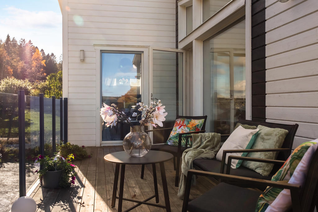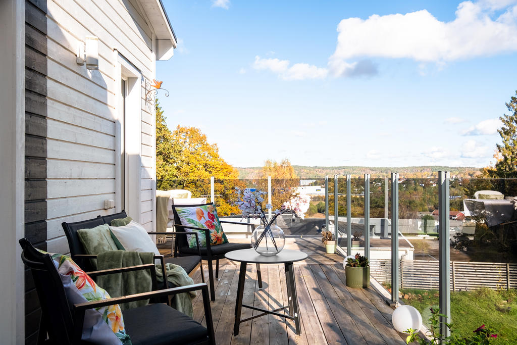 Oavsett om du vill dricka morgonkaffet i soluppgången eller skapa sena sommarkvällar med vänner i kvällssolen, så finns det alltid en plats att vara på. Terrasserna löper runt huset som levande rum under bar himmel, och glasräcken öppnar utsikten utan att stänga in.