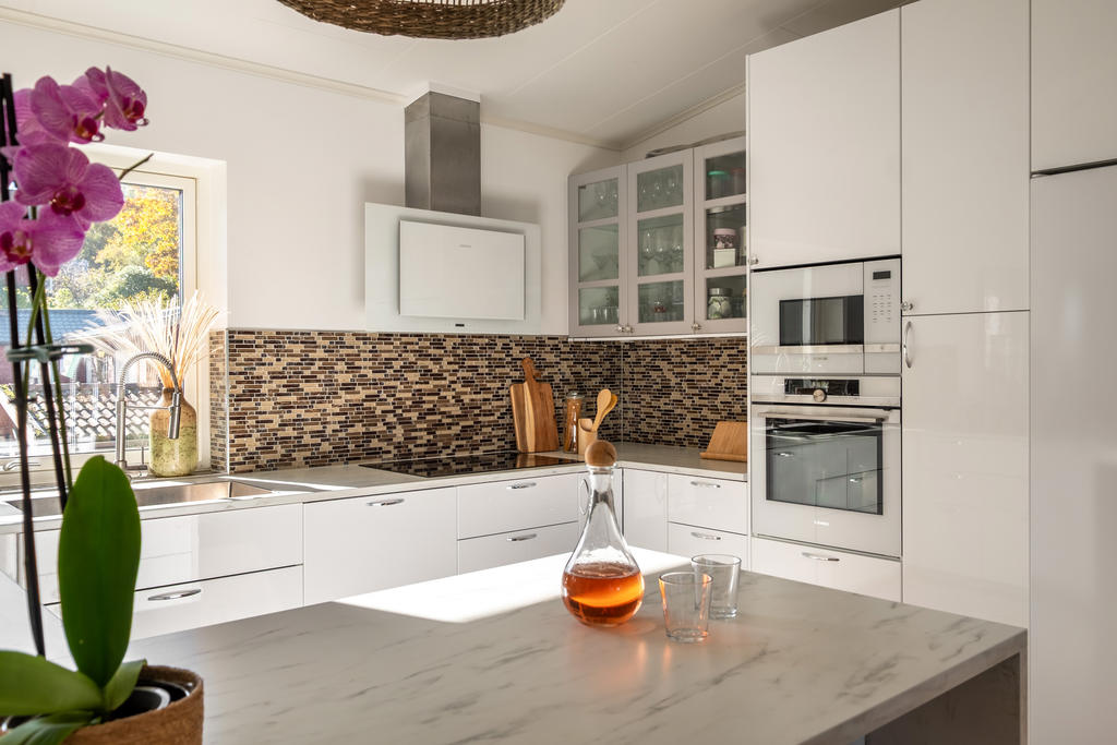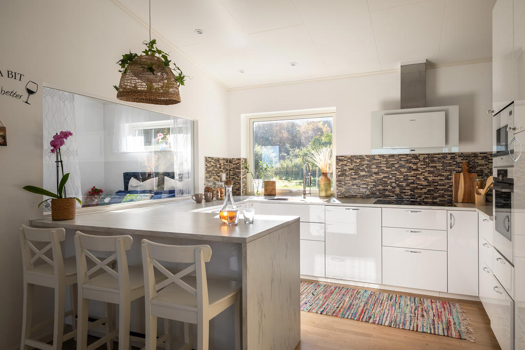 Det moderna köket är hjärtat i hemmet. Här kan du laga mat med utsikt över grönskan, duka upp på den stora köksön och låta gästerna samlas runt dig medan du förbereder middagen. Den öppna planlösningen binder ihop kök, matsal och vardagsrum på ett sätt som gör att alla får plats – oavsett om du bjuder på fredagsmys eller sommarfest.