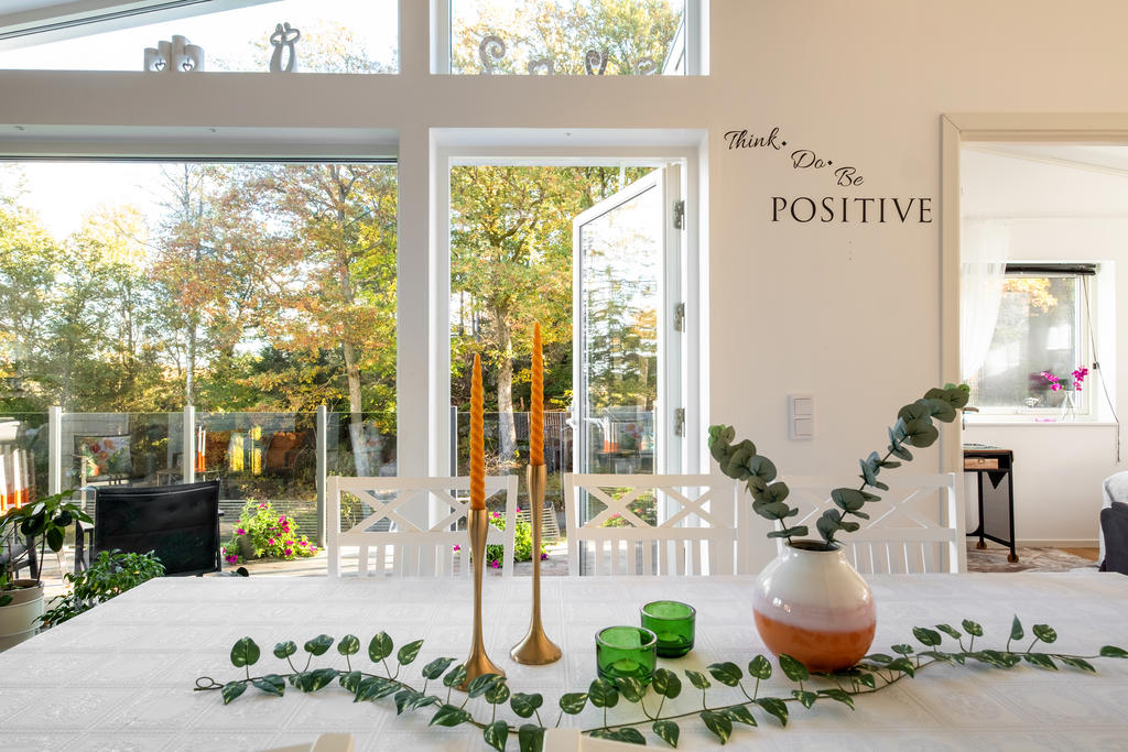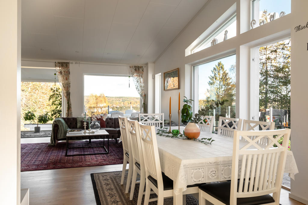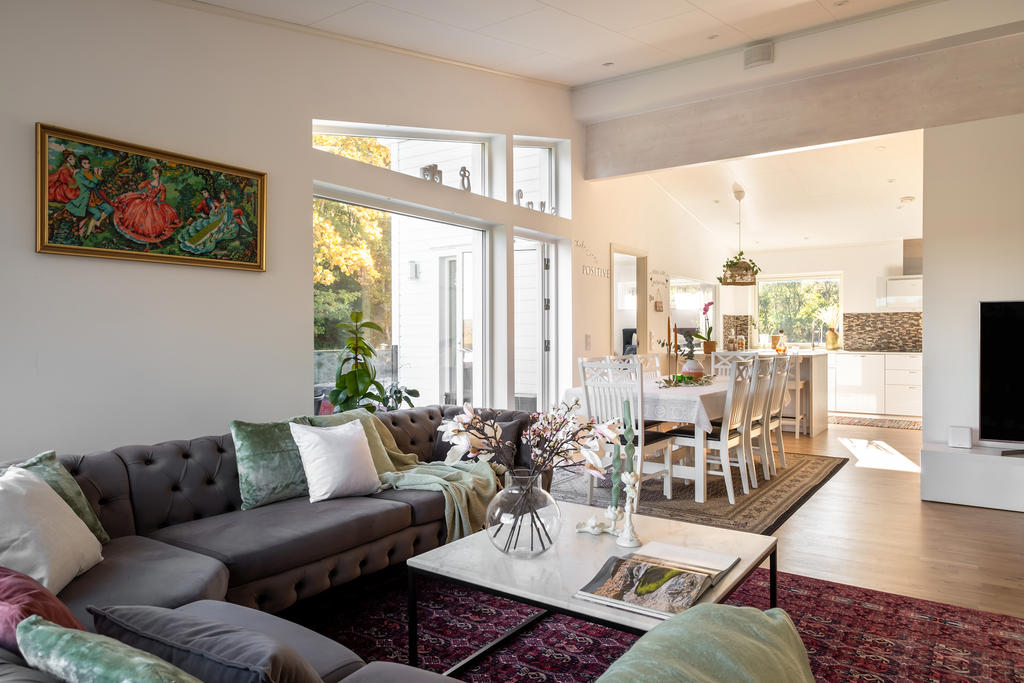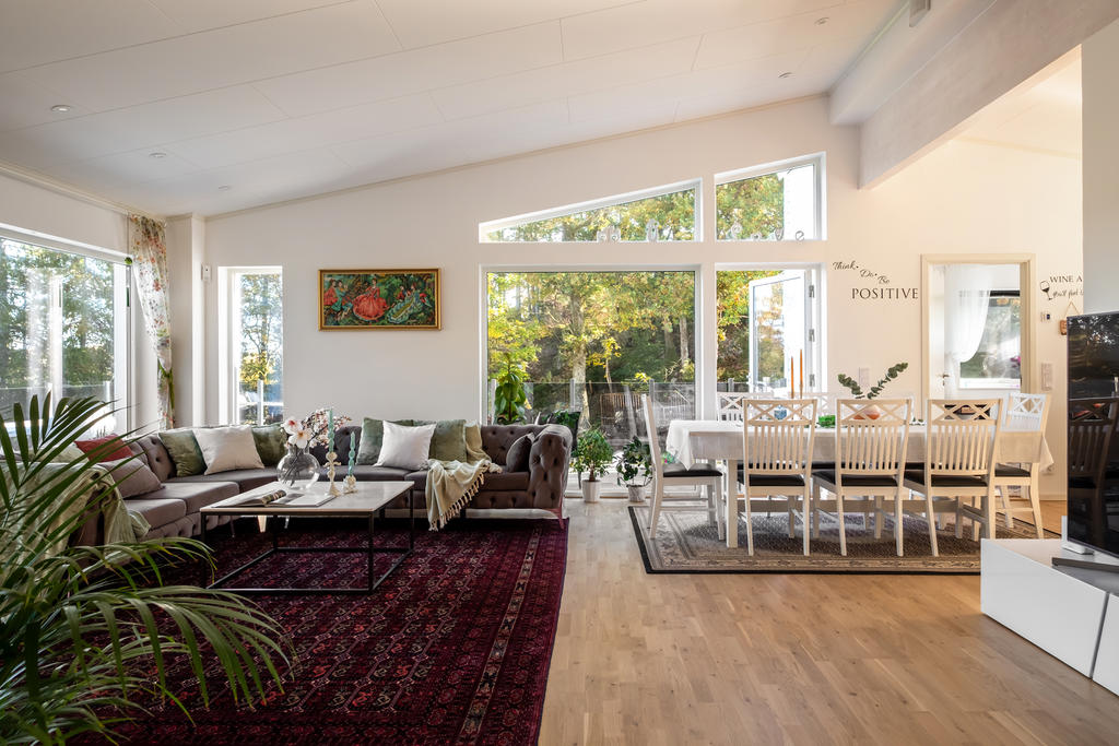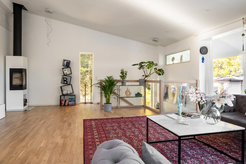 Det här huset är fullt av känsla redan från första steget in. De stora sällskapsytorna öppnar upp sig framför dig med ett fantastiskt ljusinsläpp som dansar över golven och gör att både vardag och fest känns som något extra. Takhöjden, rymden och de stora fönsterpartierna ger dig en känsla av frihet – nästan som att naturen fortsätter rakt igenom huset.