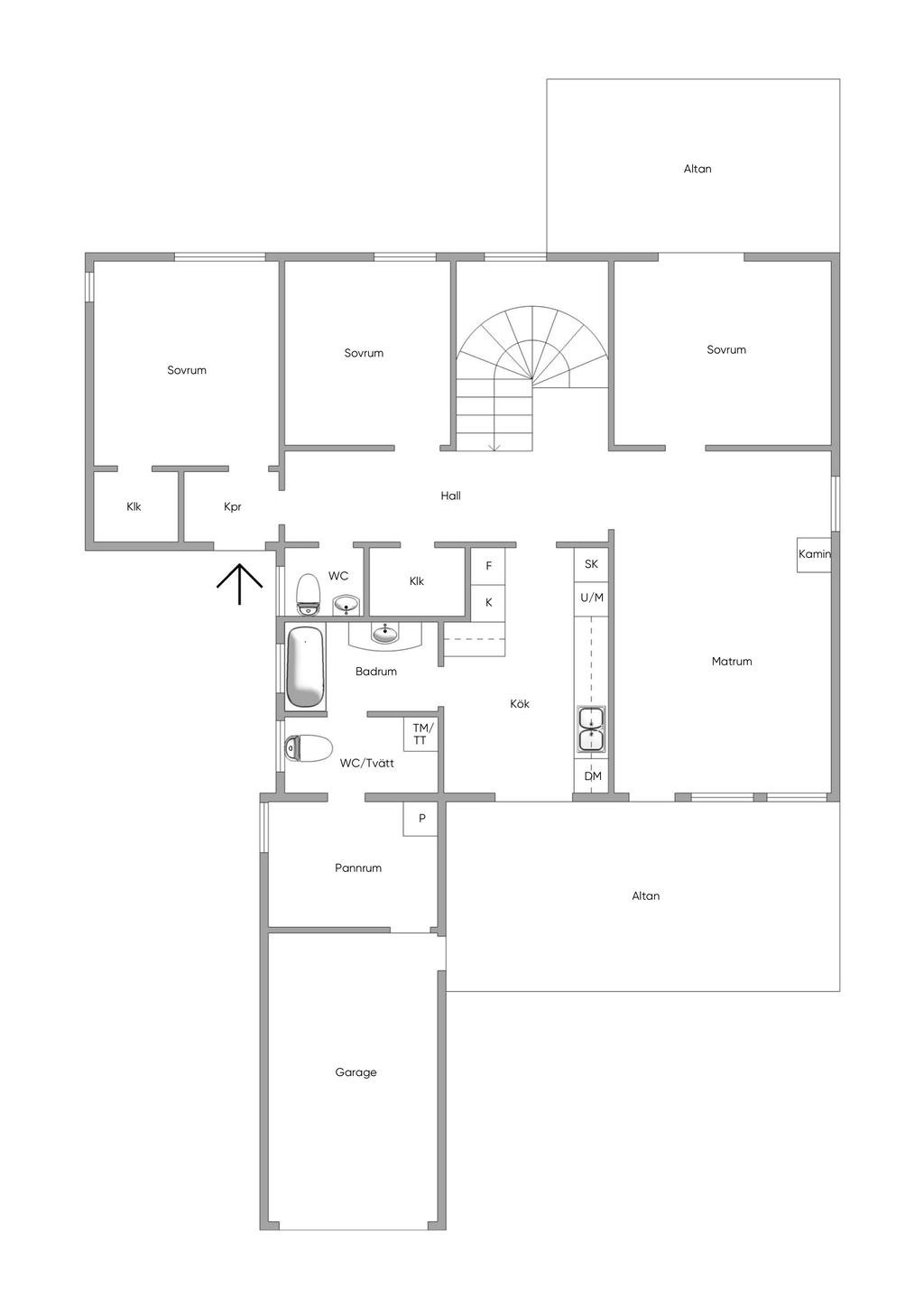 Entréplanet välkomnar med en rymlig hall som binder samman bostadens olika delar. Vidare in öppnar hemmet upp sig mot generösa sällskapsytor där vardagsrum och matsal samspelar på ett naturligt sätt. Här finns gott om plats för både soffgrupp och matsalsmöblemang och från rummet nås altanen och trädgården i ett fint läge. Köket ligger i anslutning och erbjuder goda arbetsytor och förvaring samt direkt utgång till uteplatsen – perfekt för sommarens måltider och sociala stunder. På entréplanet finns även tre sovrum samt badrum, tvättstuga och gästtoalett. Garaget nås från tvättstugan.