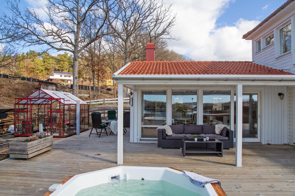 Utomhusmiljön är något alldeles extra. Den soldränkta altanen i västerläge bjuder på magisk havsutsikt och har gott om plats för både middagar och lata dagar i solen. En del av altanen ligger skyddad under tak, vilket skapar en trivsam plats även när vädret skiftar. Här finns även ett spabad som förhöjer livskvaliteten ytterligare.