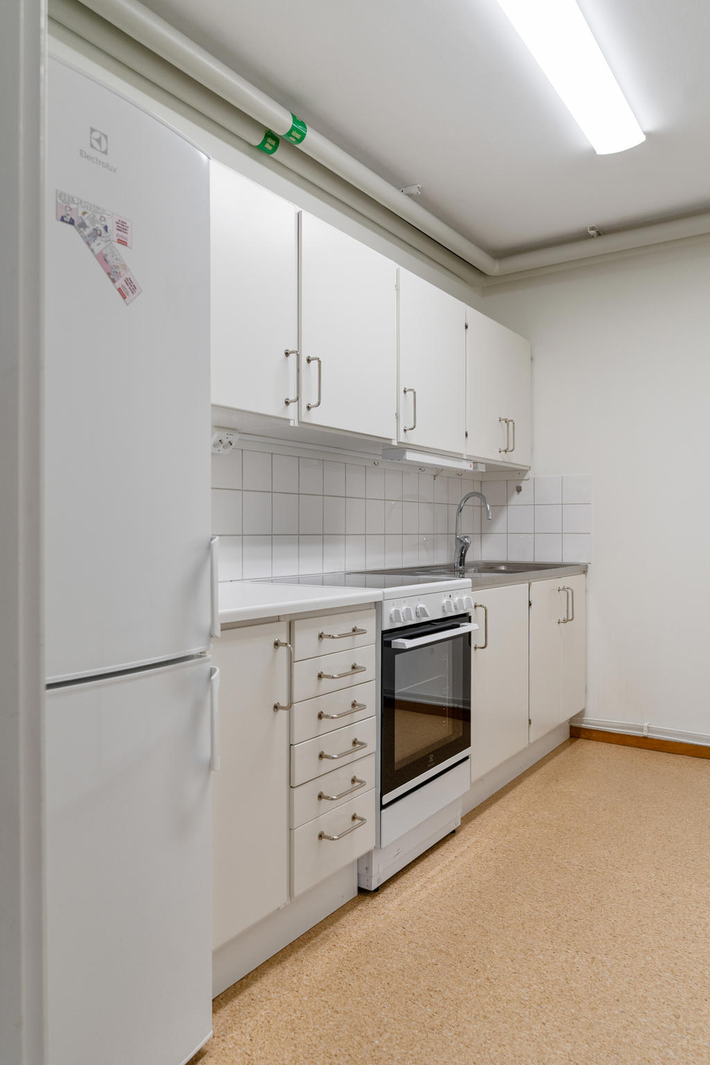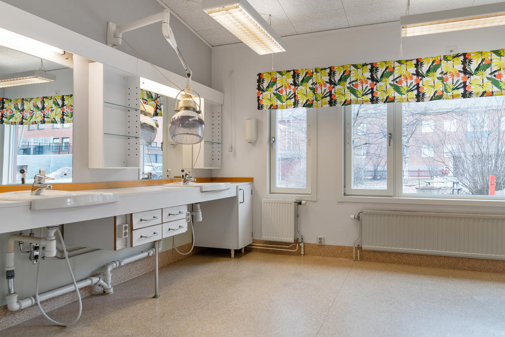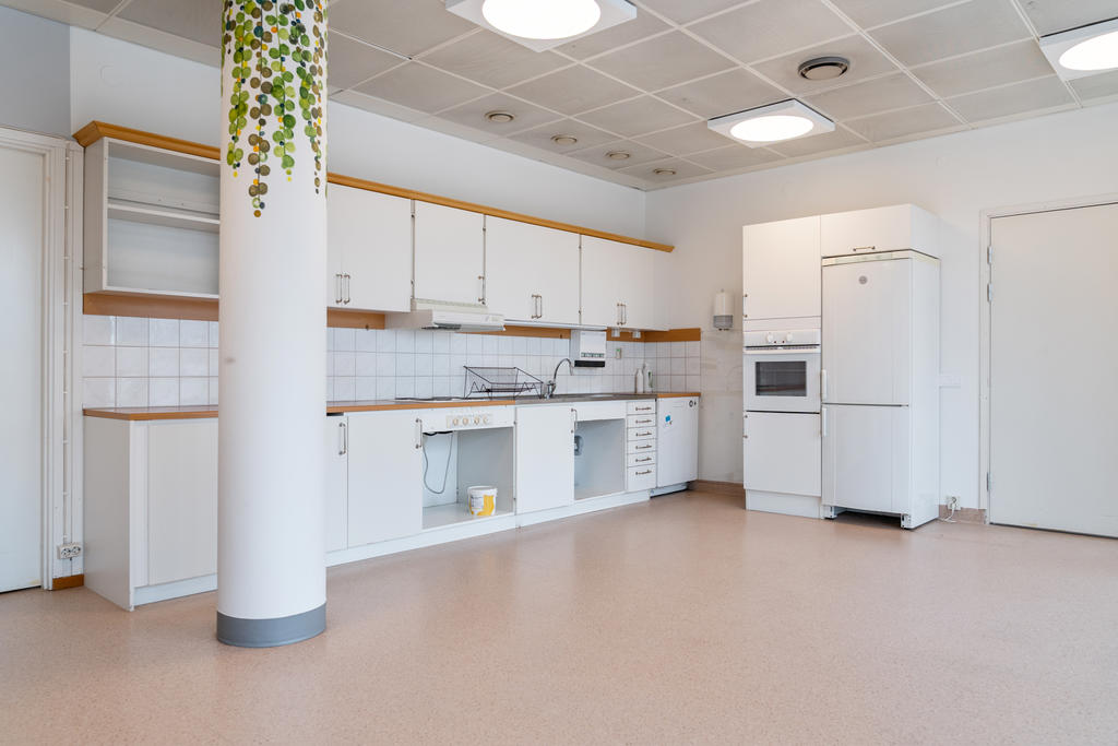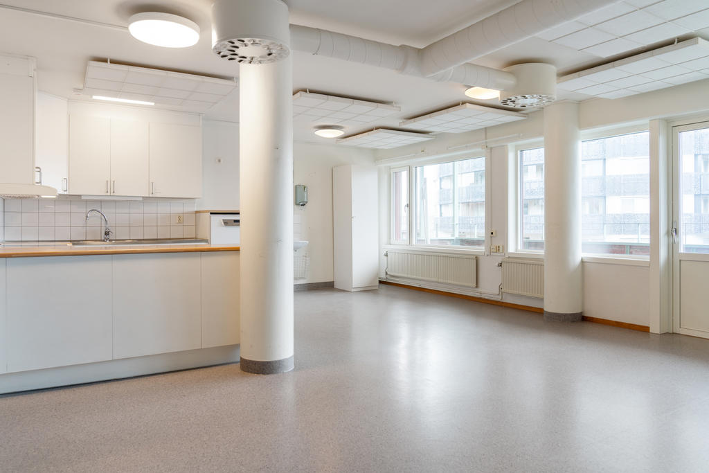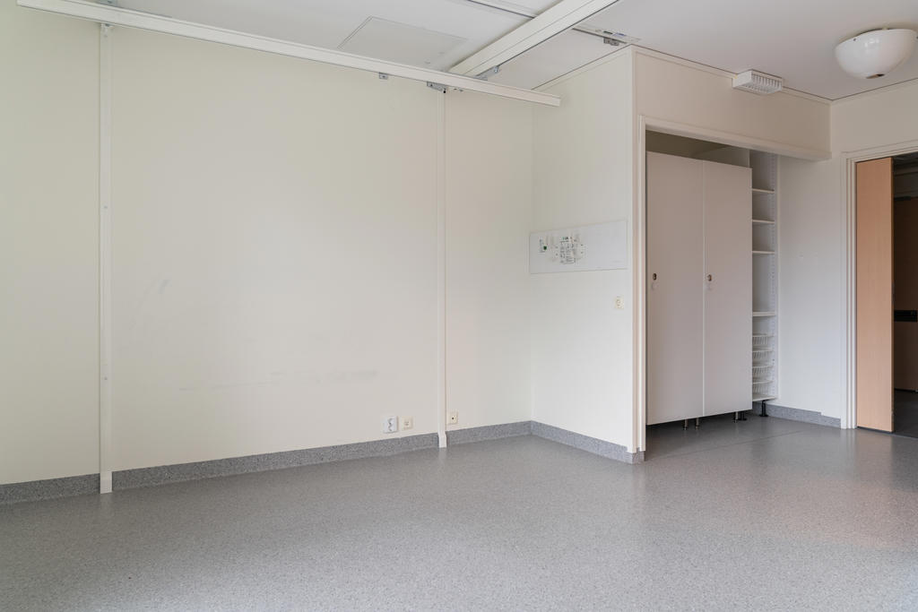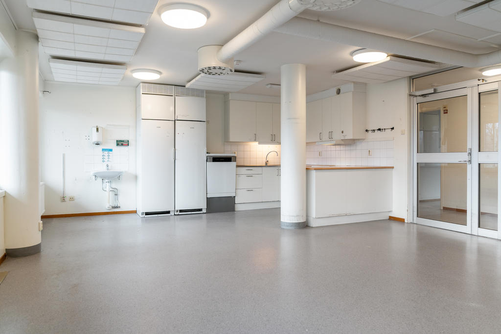 Bottenplan i byggnad B innehåller idag bland annat kök, kontor, behandlingsrum och gemensamma ytor.