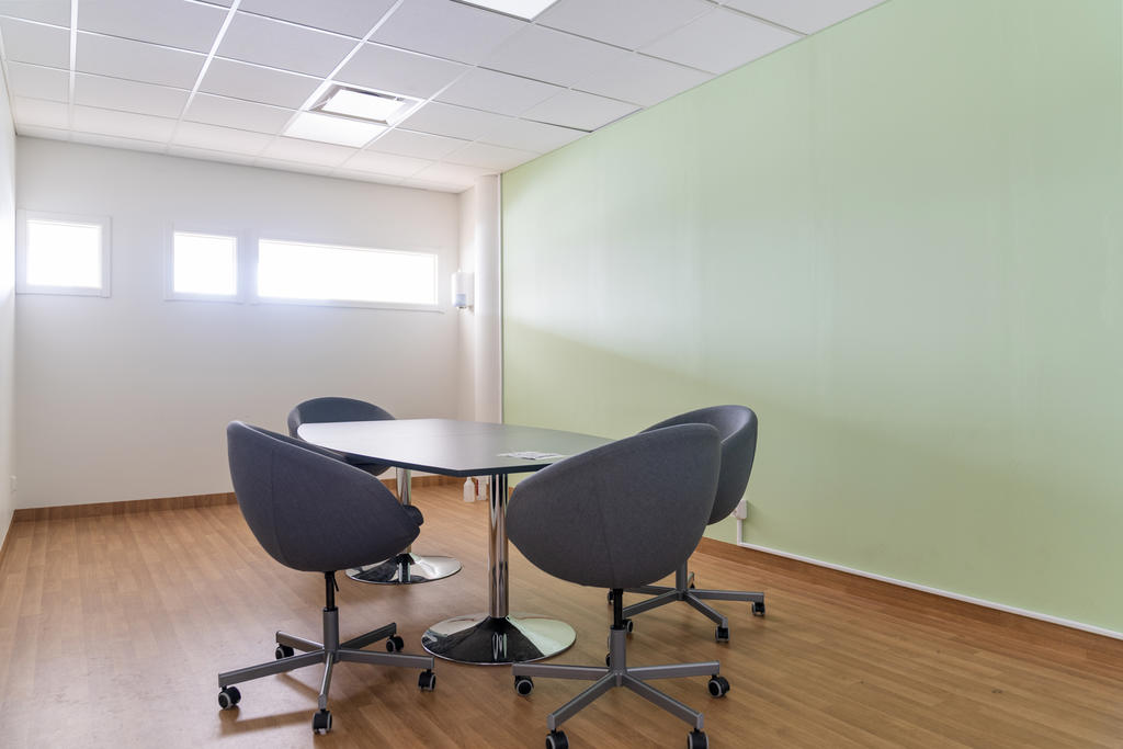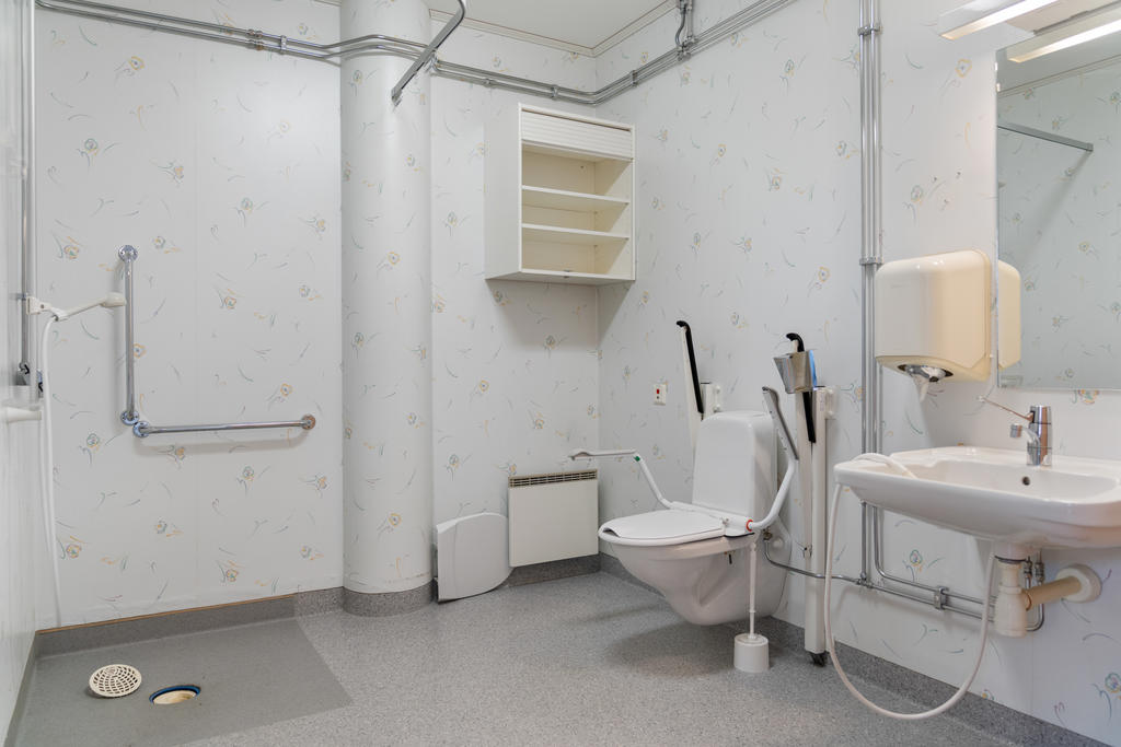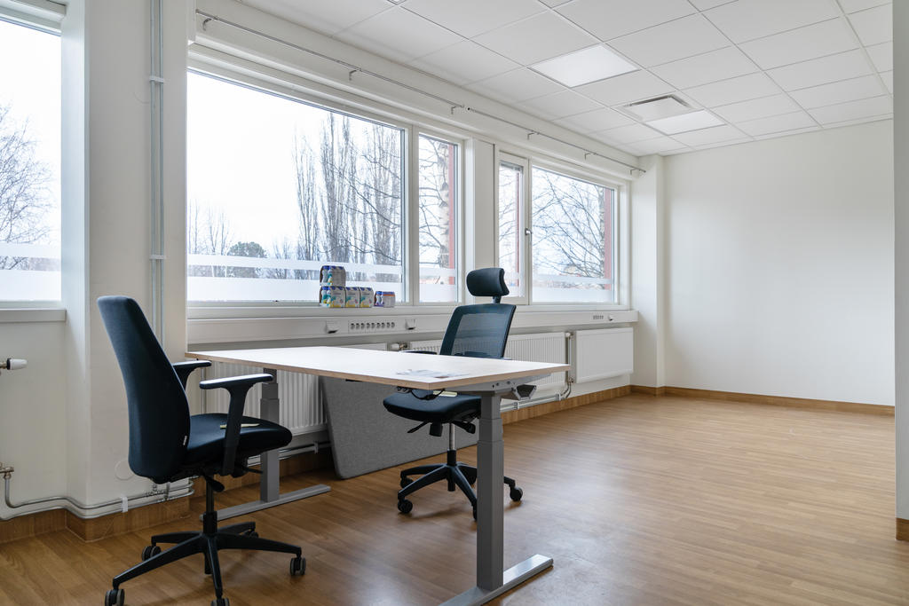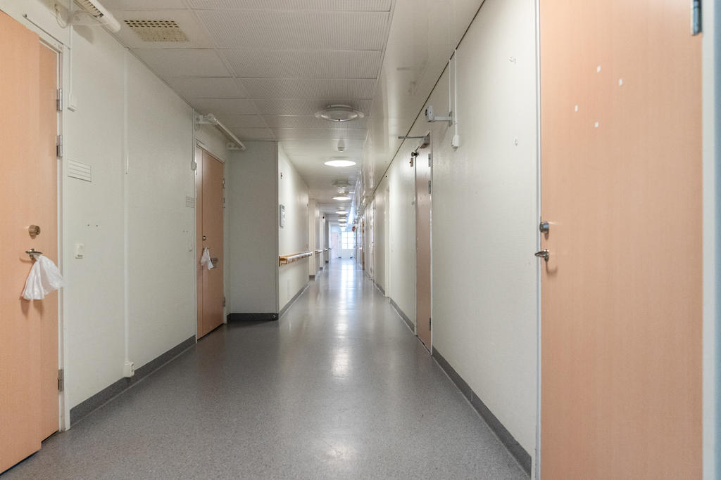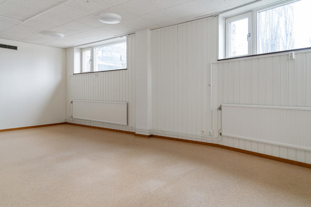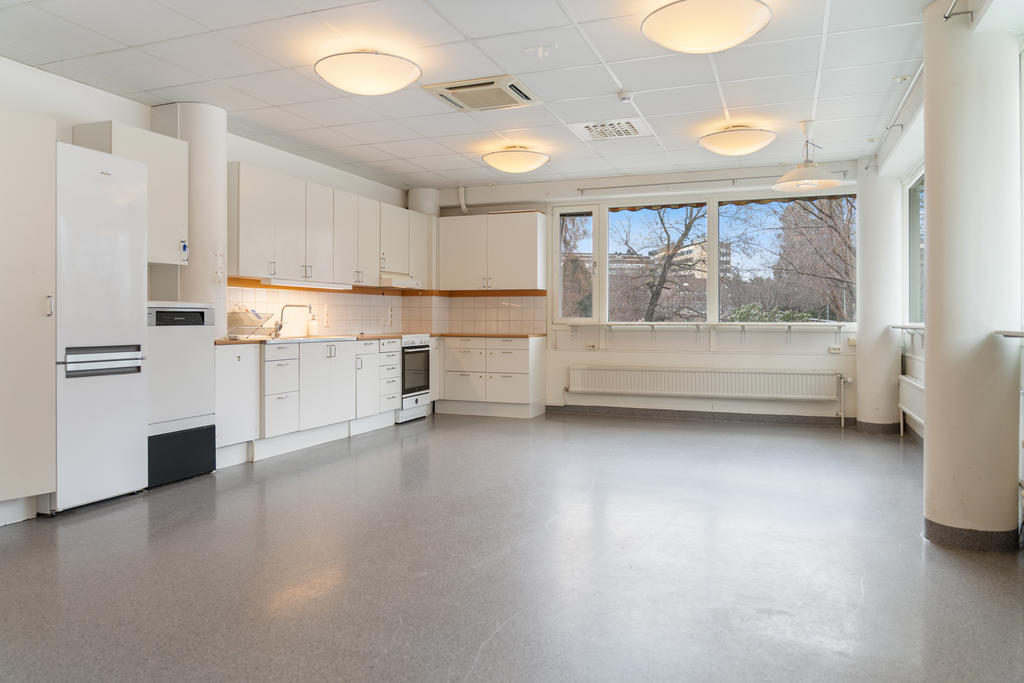 Bottenplan i byggnad B innehåller idag bland annat kök, kontor, behandlingsrum och gemensamma ytor.