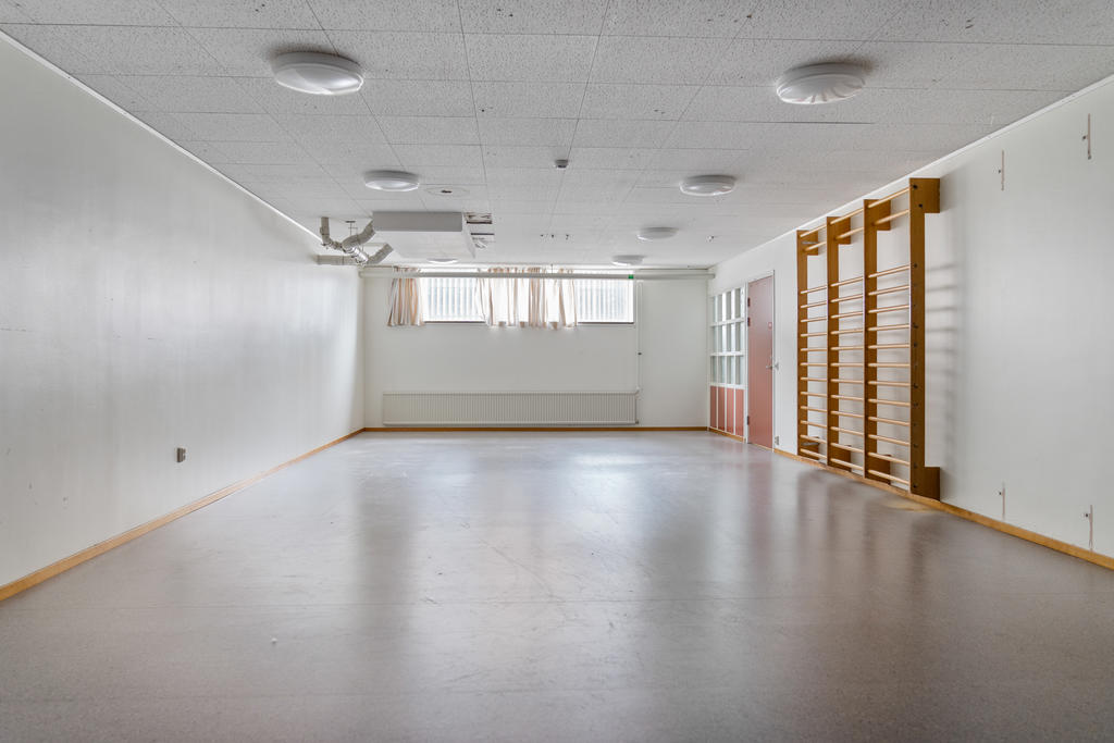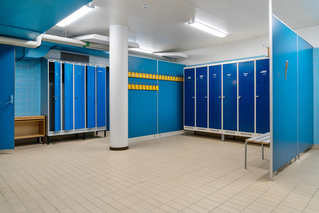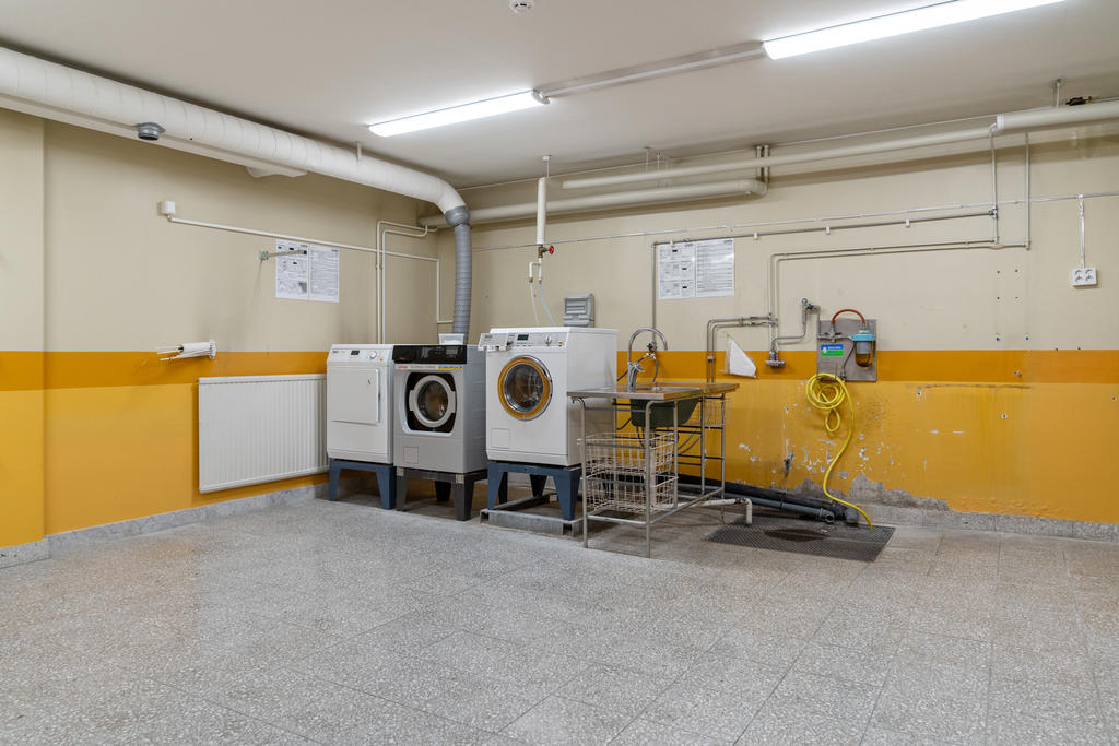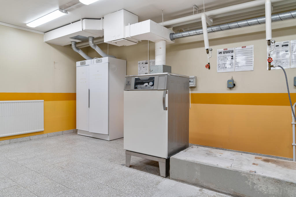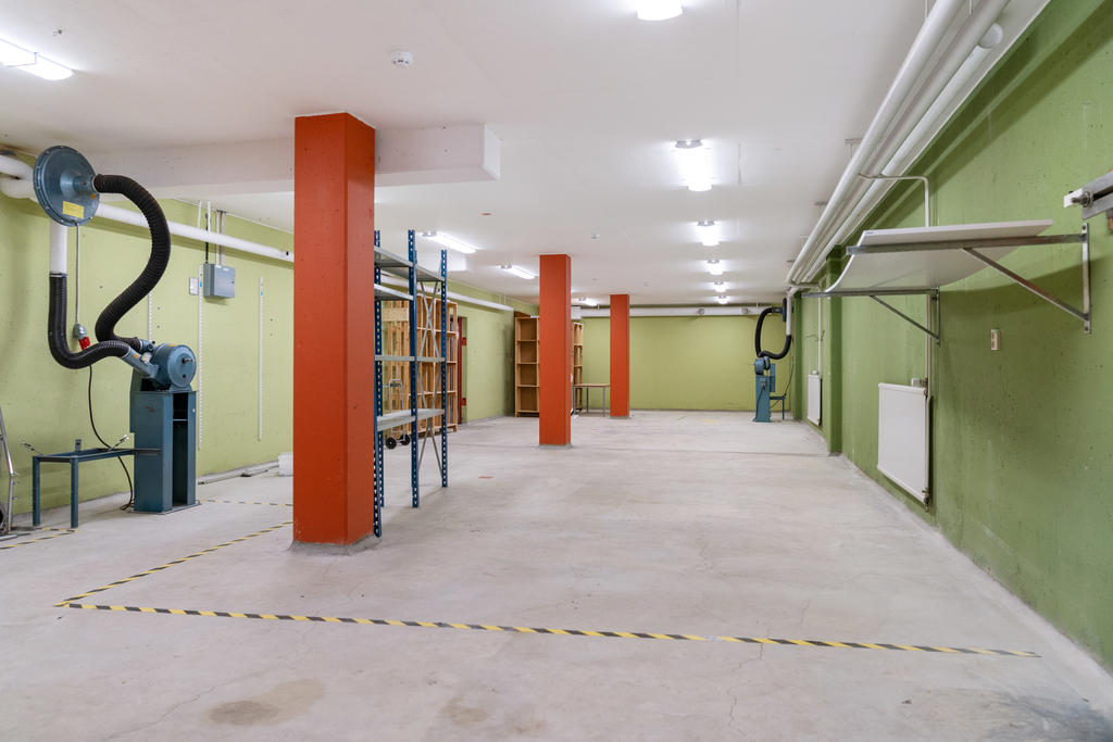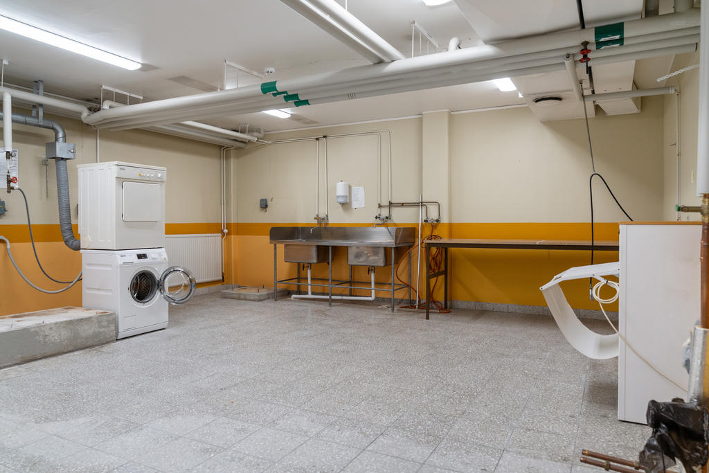 Källaren innehåller tvättstugor, förråd, omklädningsrum med duschar samt idrottshall.