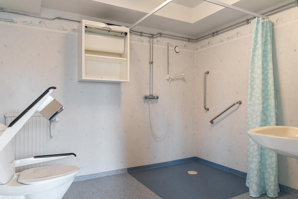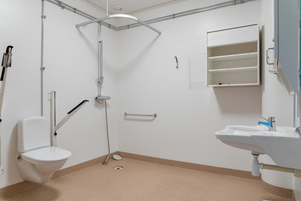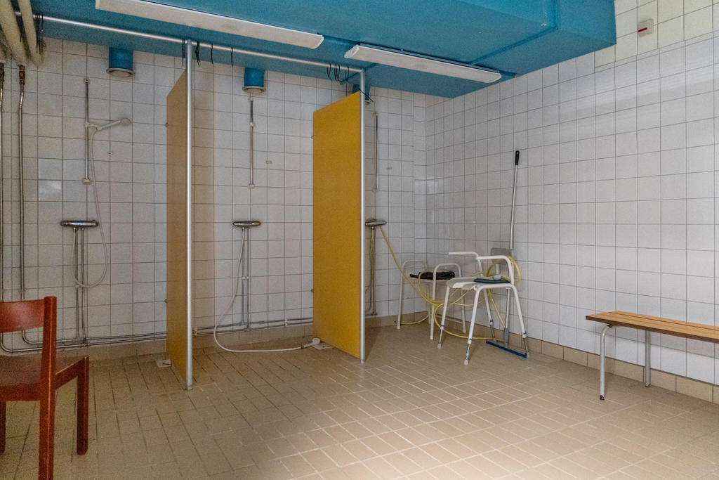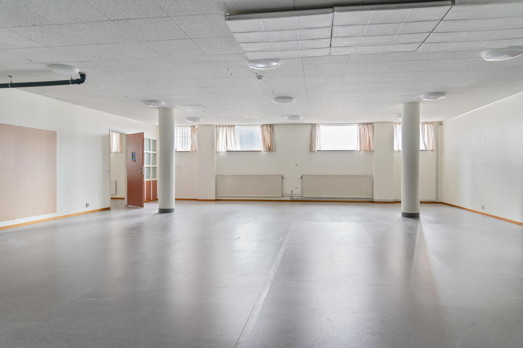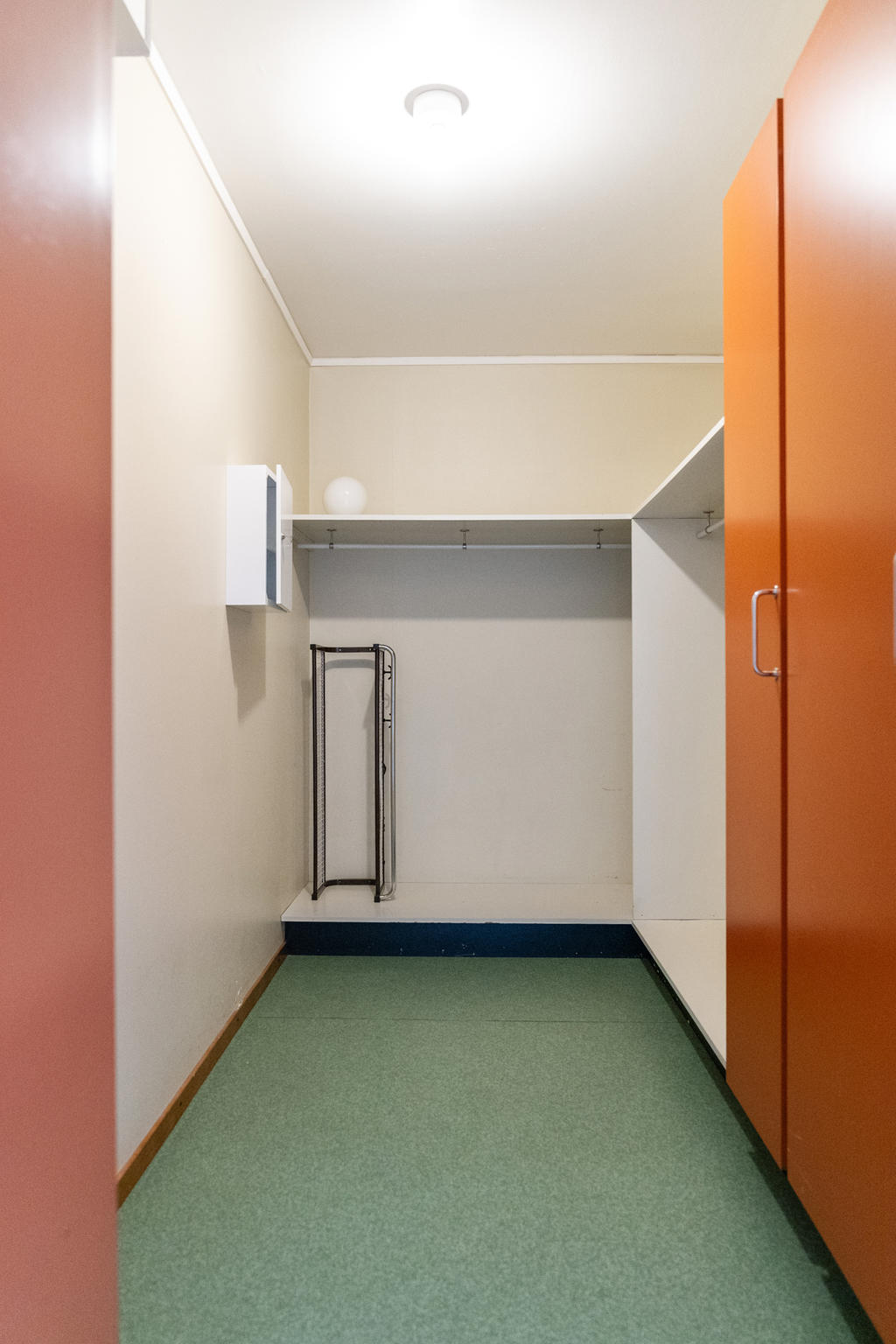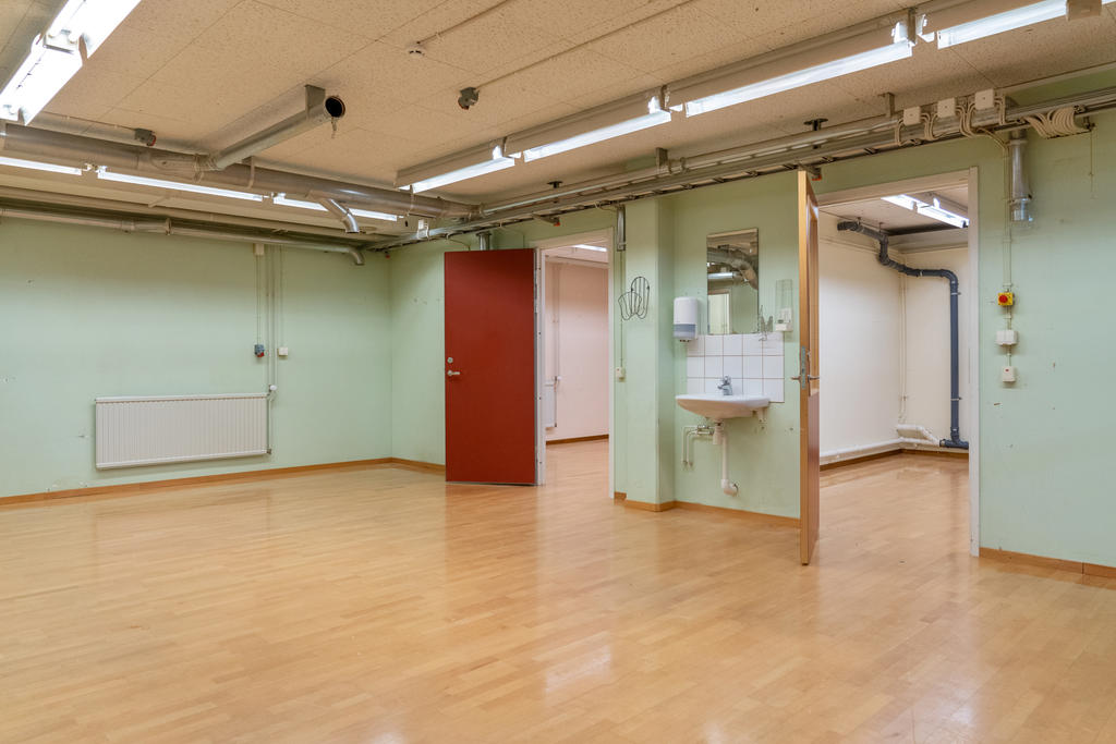 Källaren innehåller tvättstugor, förråd, omklädningsrum med duschar samt idrottshall.