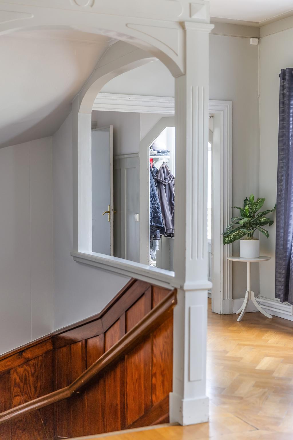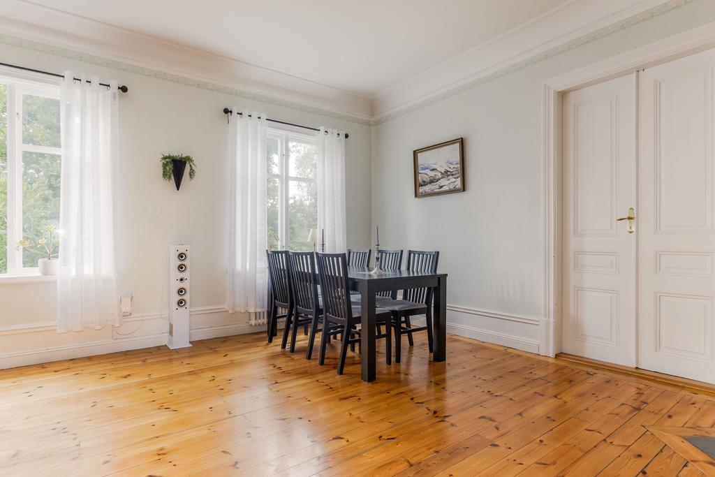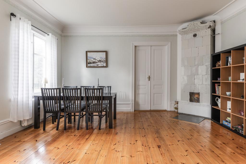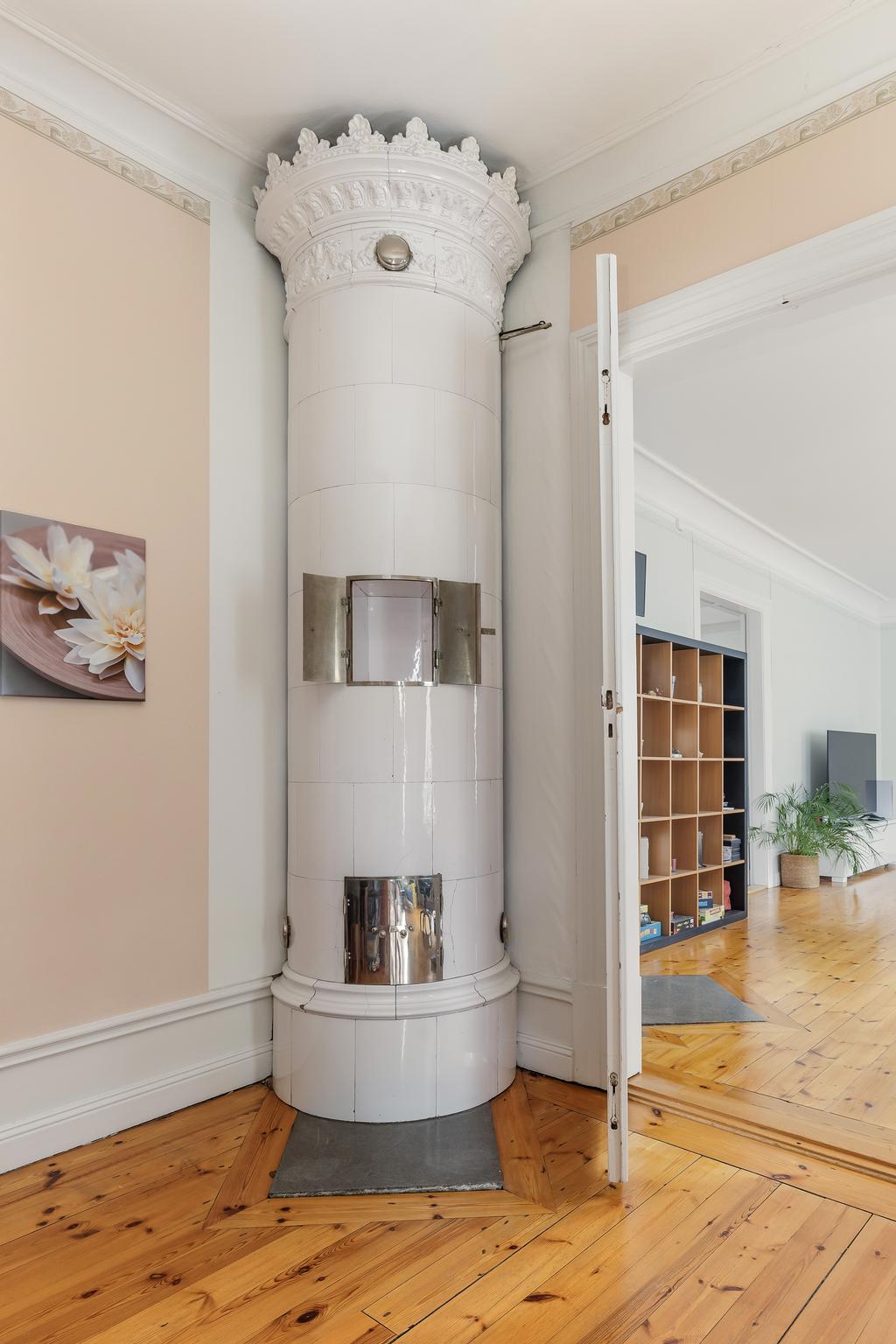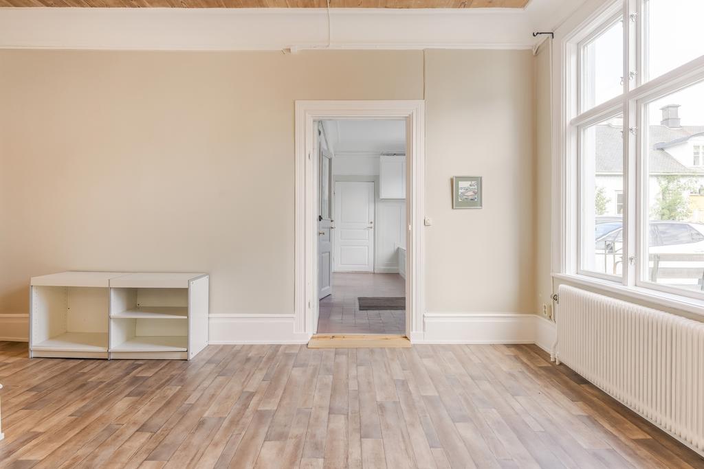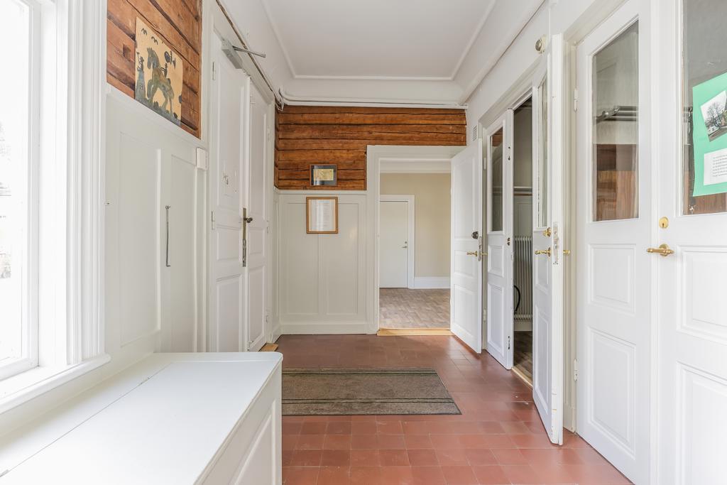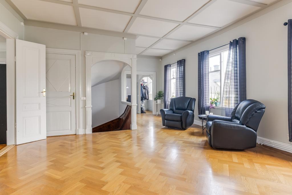 Idag består byggnaden av en lägenhet på våning 2. Bestående av 6 rok. Där takhöjden ger en fantastisk känsla av rymd! Kakelugnar och detaljer i trä finner vi även på denna våning.
