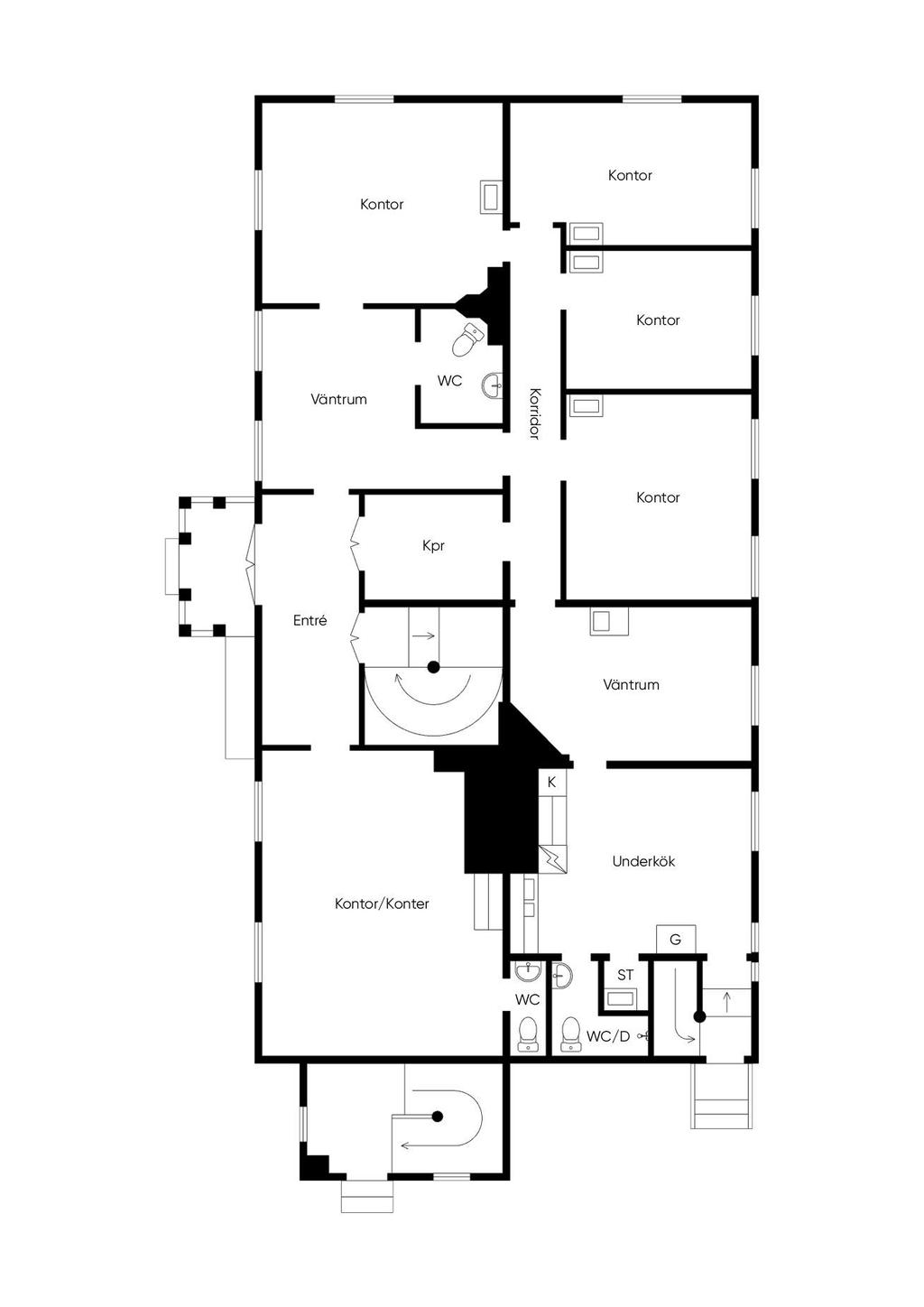 På entréplan som i dagsläget står vakant finns den gamla läkarmottagningen som nuvarande ägare drivit under många år. Dock senast samtalsmottagning. Här finner vi 8 rum samt toaletter samt entré och kapprum.