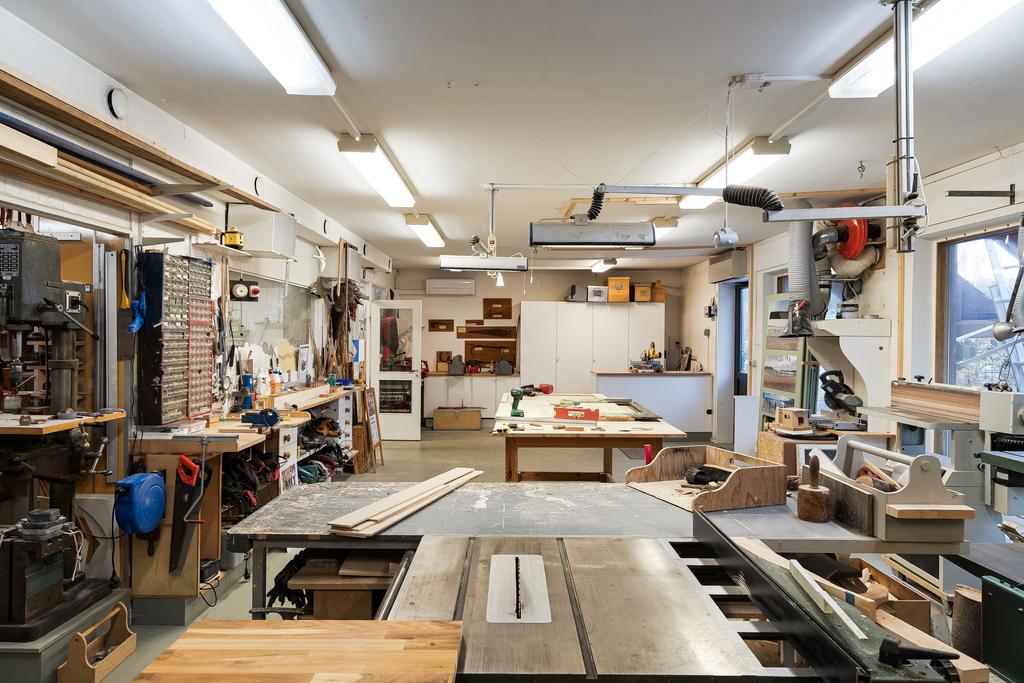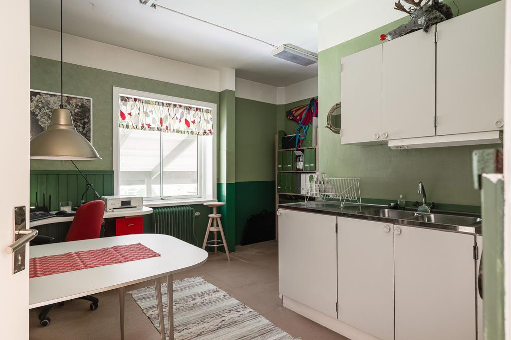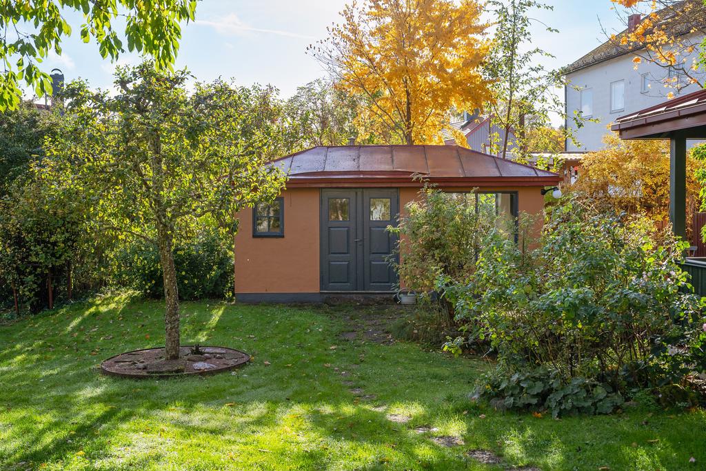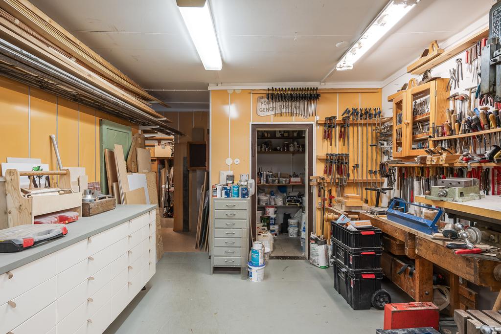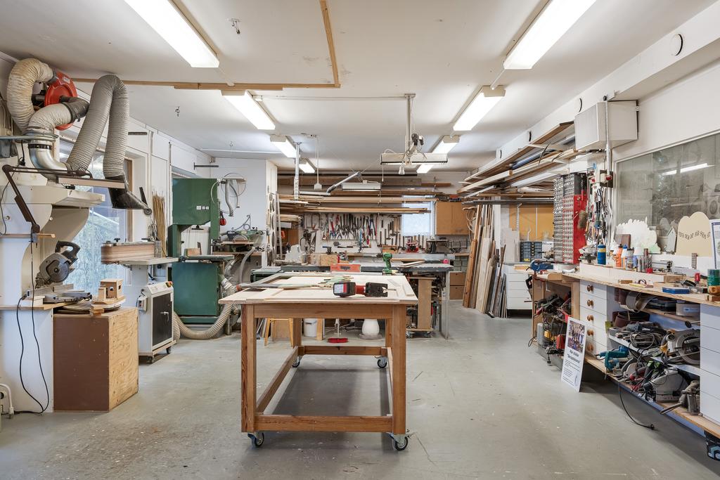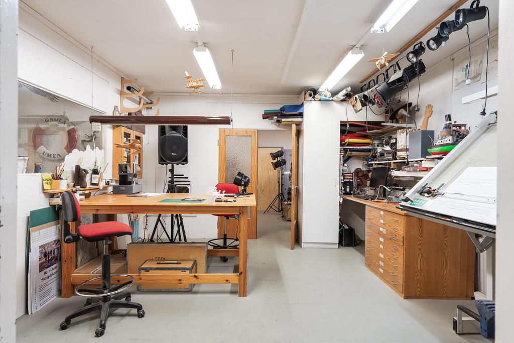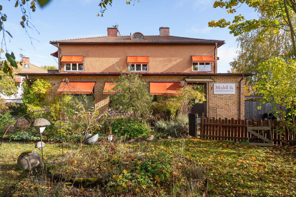 Denna fastighet är uppförd 1941 och har fina proportioner och gott om plats även utvändigt med två generösa parkeringar. Entréplanet utgörs av flera rum med en större och mindre verkstad /ateljé och flera förråd, kontor med kök samt ett badrum med dusch. Den större verkstaden har gott om ljus från tre stora skyltfönster efter tiden som ICA affär. Här finns utgång mot både entrésidan och trädgården med tillhörande uteplatser.
