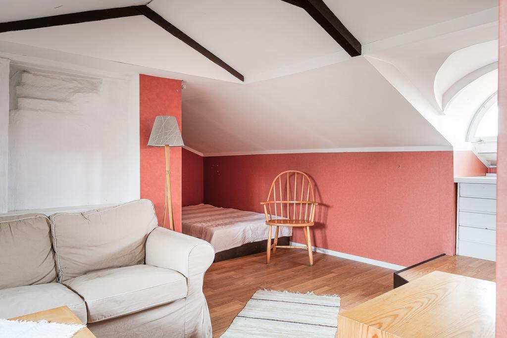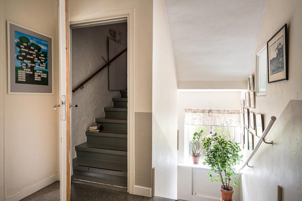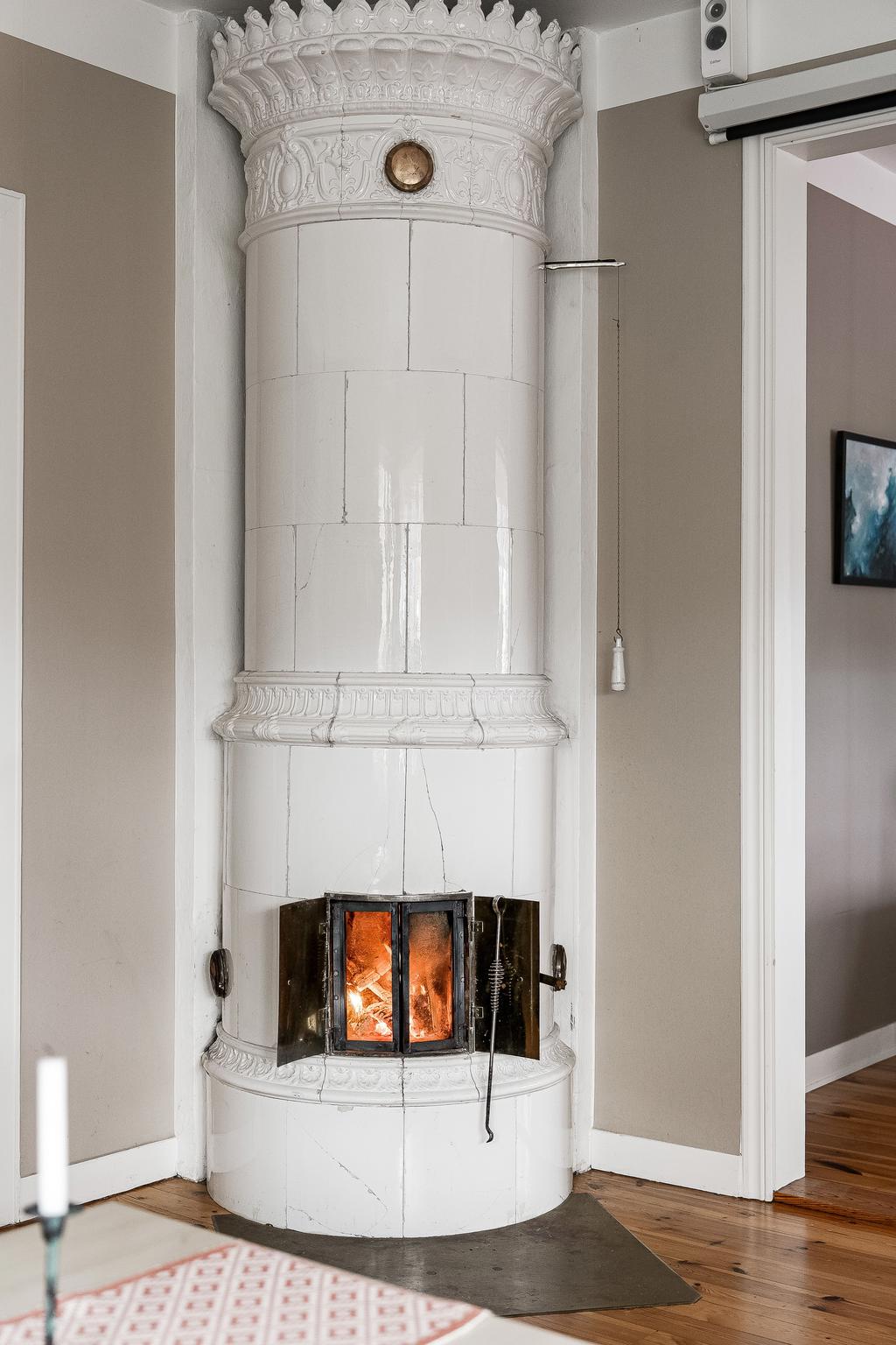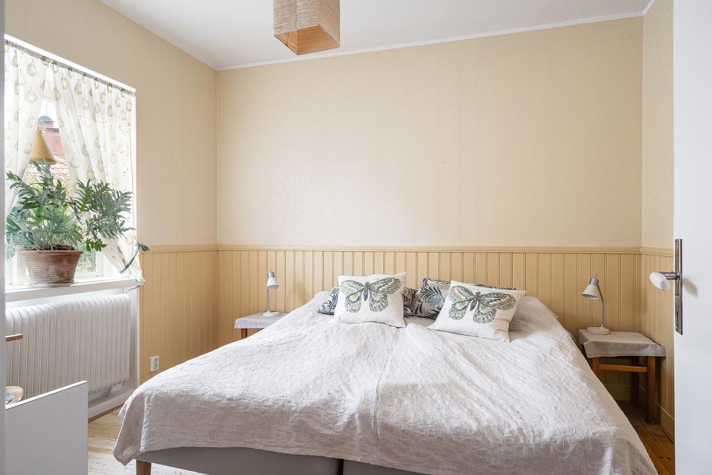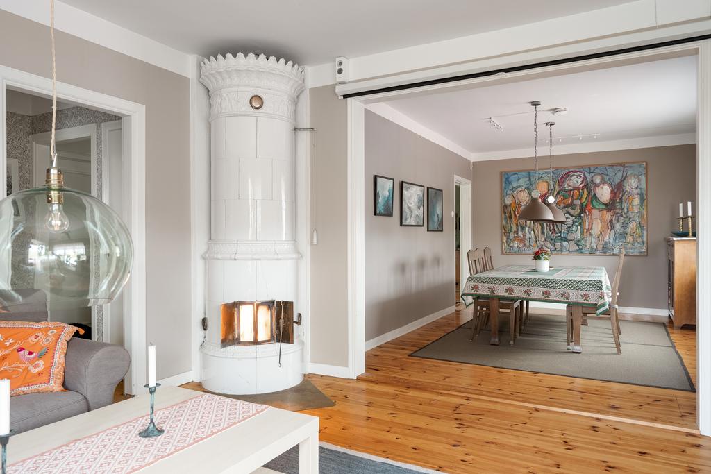 Det övre planet fungerar som en bostad i sin helhet med trivsamma rumsligheter som kan rymma fler eller färre sovrum. I dagsläget fördelas funktionen med två ljusa och rymliga sovrum i varsitt "hörn" där ett av rummen har egen balkong. Här finns även två badrum varav ett med dusch och det andra med badkar och det finns en inre hall med kapprum intill "trapphuset". Köket är tilltalande och gemytligt i en härligt lantköksstil med vackra beslag och delvis en återskapad känsla av 40 tal. Det finns gott om skåpsutrymmen och fina detaljer med vedspis och skafferi samt en mysig matplats vid fönstret med utsikt över trädgården och villaområdet. Utöver detta ges plats för två stora allrum såsom matsal och vardagsrum intill varandra där det även finns kakelugn och balkong. Till bostaden hör också ett inrett rum på vinden, samt en oinredd del.