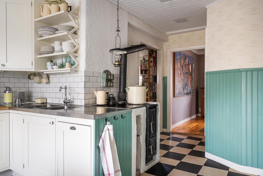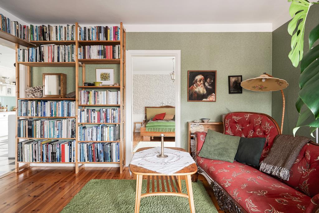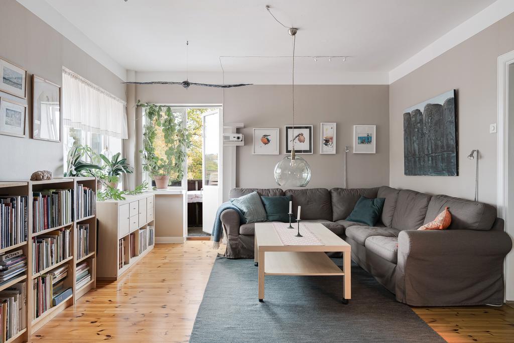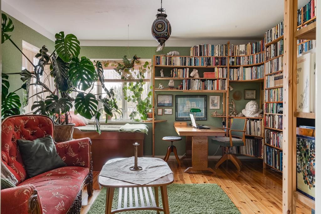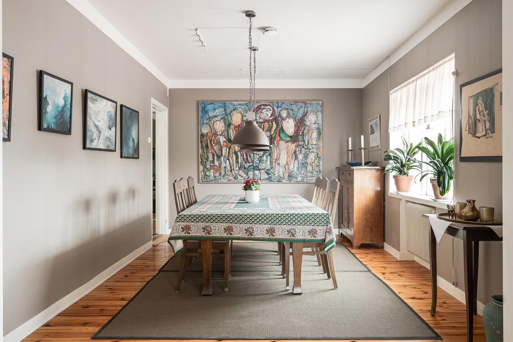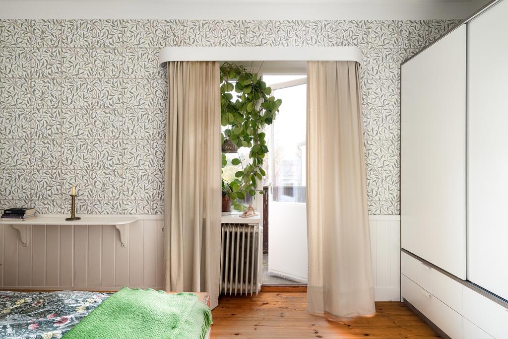 Det övre planet fungerar som en bostad i sin helhet med trivsamma rumsligheter som kan rymma fler eller färre sovrum. I dagsläget fördelas funktionen med två ljusa och rymliga sovrum i varsitt "hörn" där ett av rummen har egen balkong. Här finns även två badrum varav ett med dusch och det andra med badkar och det finns en inre hall med kapprum intill "trapphuset". Köket är tilltalande och gemytligt i en härligt lantköksstil med vackra beslag och delvis en återskapad känsla av 40 tal. Det finns gott om skåpsutrymmen och fina detaljer med vedspis och skafferi samt en mysig matplats vid fönstret med utsikt över trädgården och villaområdet. Utöver detta ges plats för två stora allrum såsom matsal och vardagsrum intill varandra där det även finns kakelugn och balkong. Till bostaden hör också ett inrett rum på vinden, samt en oinredd del.