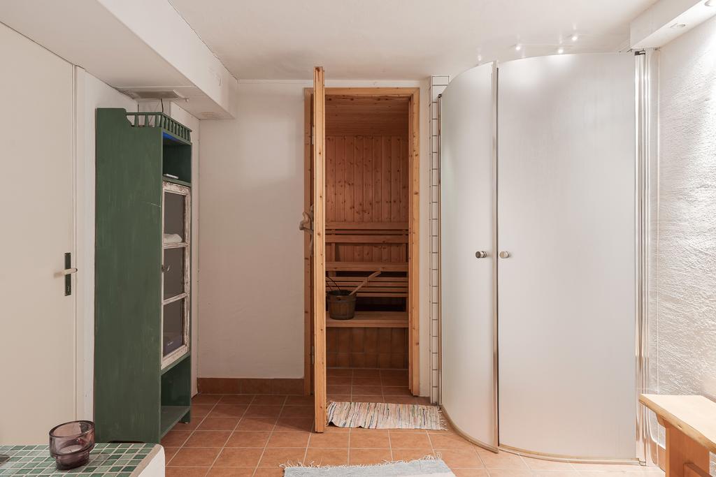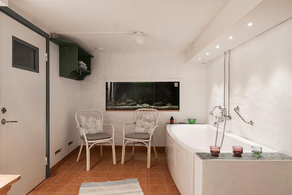 Fastigheten har även en större källare med generösa förrådsutrymmen, en tvättstuga med mangel och tvättmaskiner samt WC. Här finns också en rymlig spa avdelning med både dusch, badkar samt bastu. Helheten av denna del är frikostigt med förråd och med garage med öppning in mot trädgården. En del av källarplanet är avskilt med egen ingång och kan hyras ut om man så vill.