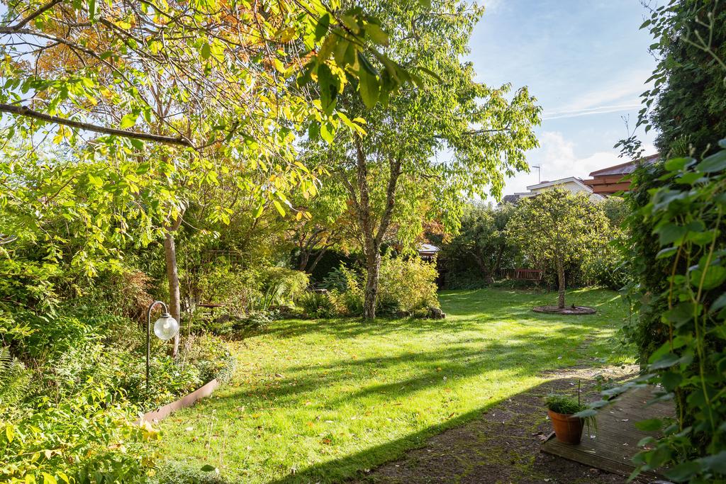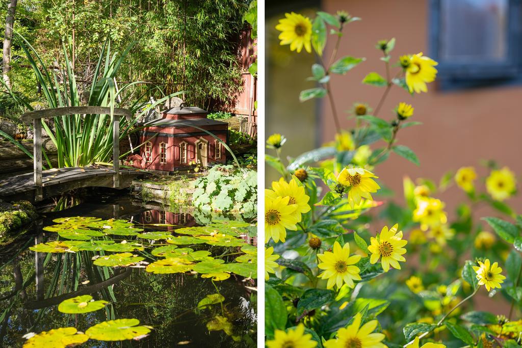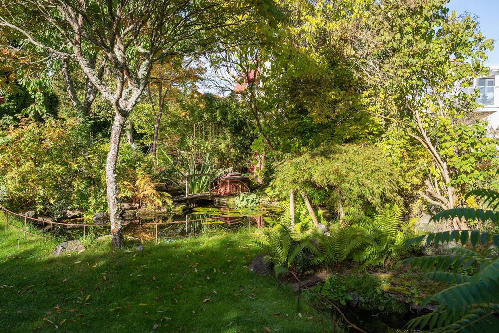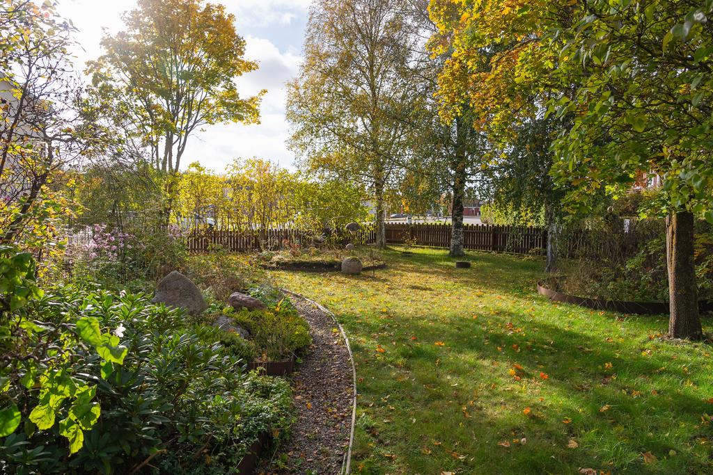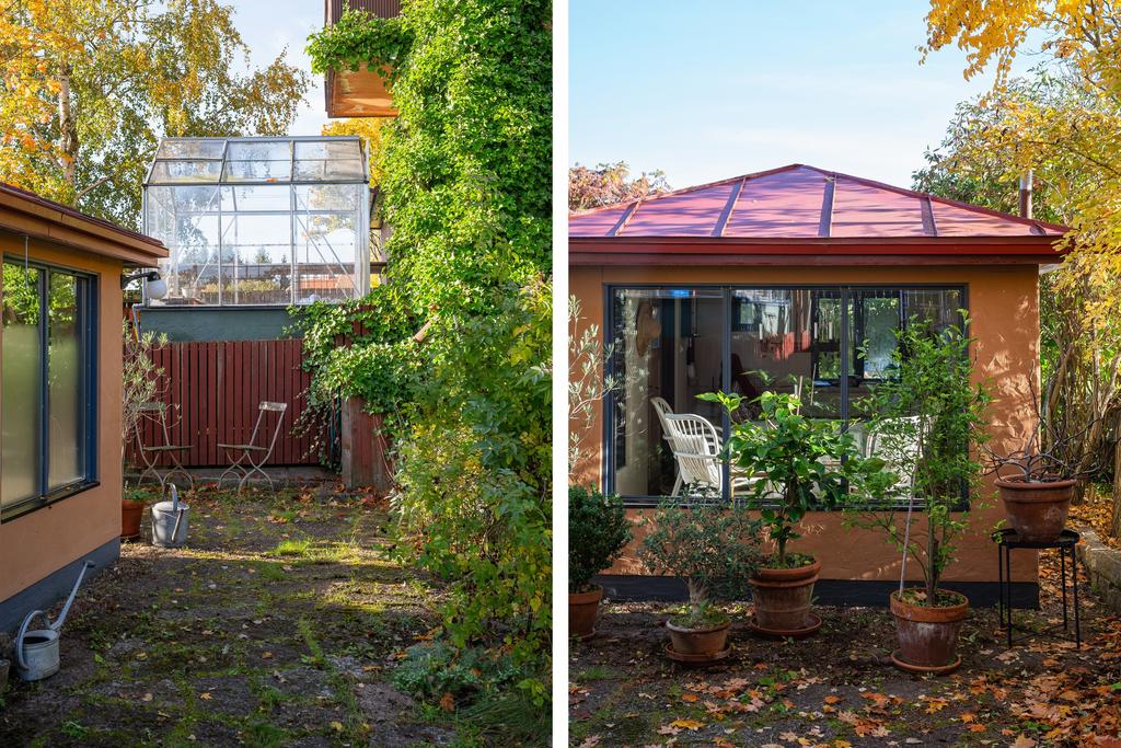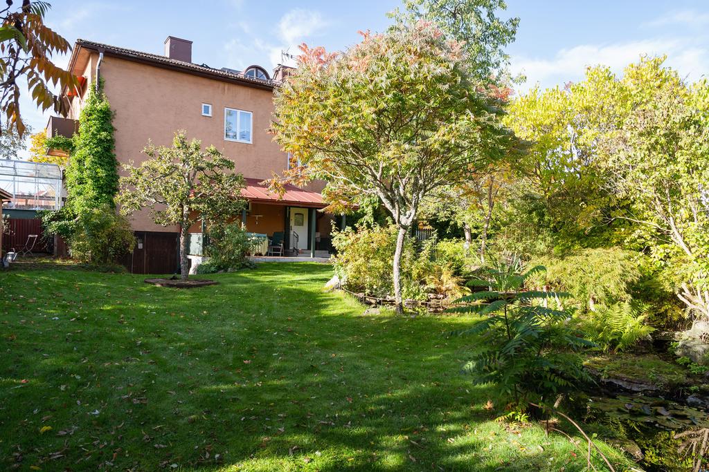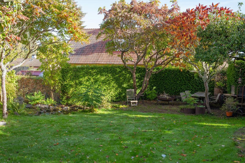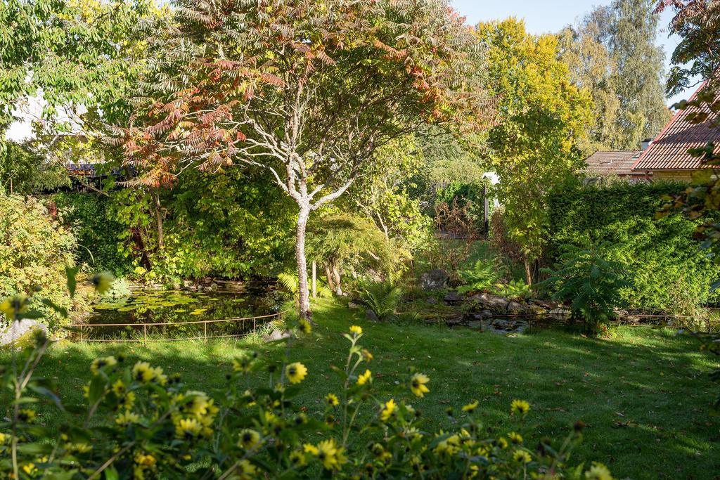 Trädgården är en prunkande oas, skyddad och ombonad av lummighet och frodig växtlighet. Vackra träd och buskar, en egen ståtlig damm full med fiskar och djurliv och flera platser där man kan njuta av denna avskilda dröm av klorofyll och färger. På tomten finns även ett Orangeri dess rätta bemärkelse, där trädgårdens citrusträd samsas om utrymmet på vintern. Fint ljus kommer in från stora fönster och i täljstenskaminen eldar man, så det blir skönt även kulna sensommardagar. Här samlas man gärna i sociala sammanhang eller i avkopplande stillhet med en god bok oavsett väderlek med gott om utrymme för flera möblemang.
