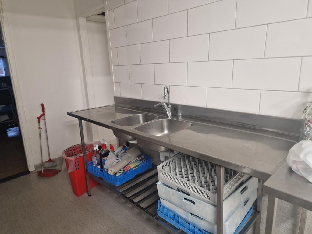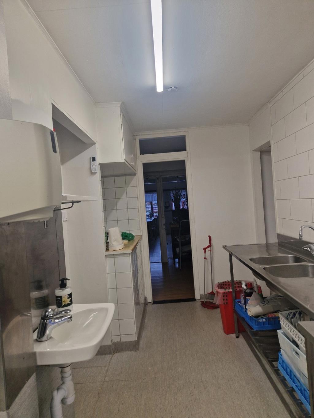 I restaurangens arbetsdel finns förutom själva köket goda förvaringsutyrmmen, omklädningsrum, personaltoalett samt ett kontorsrum.