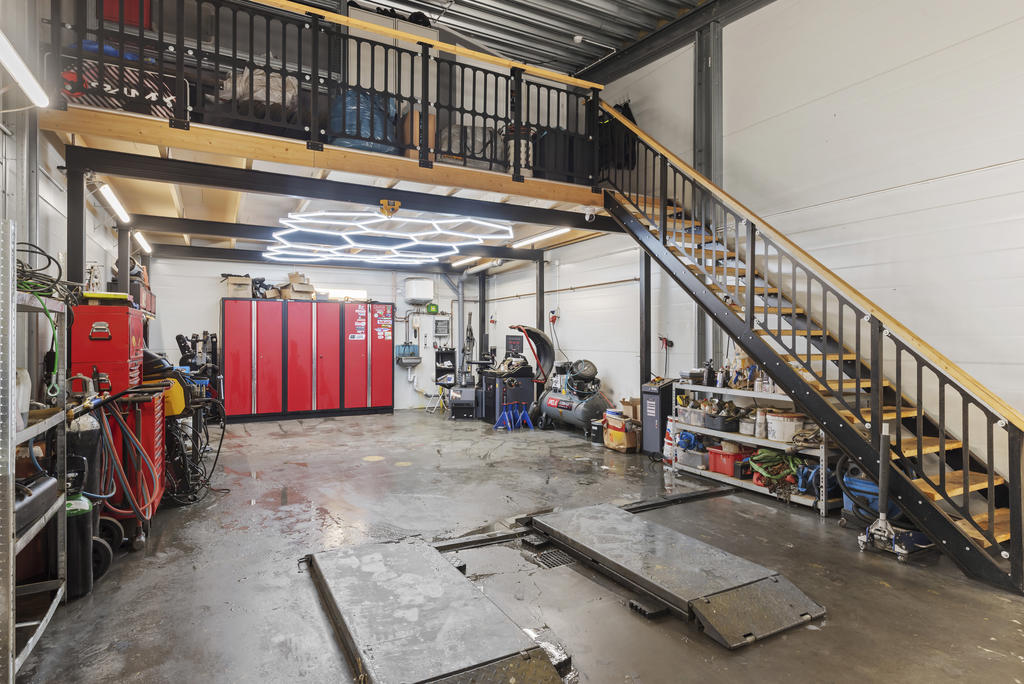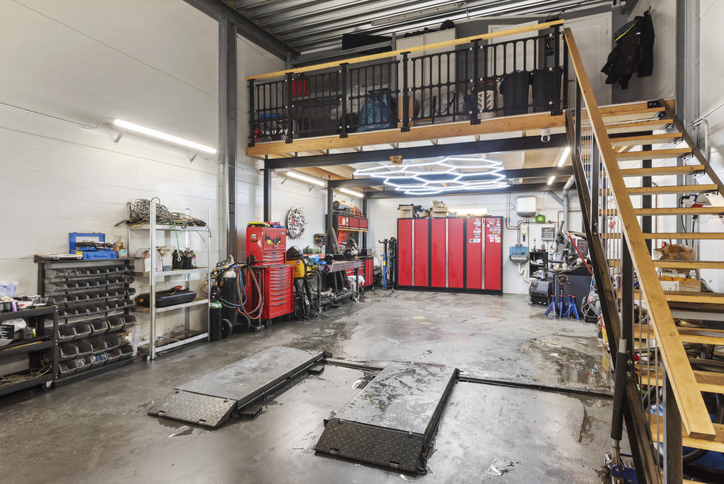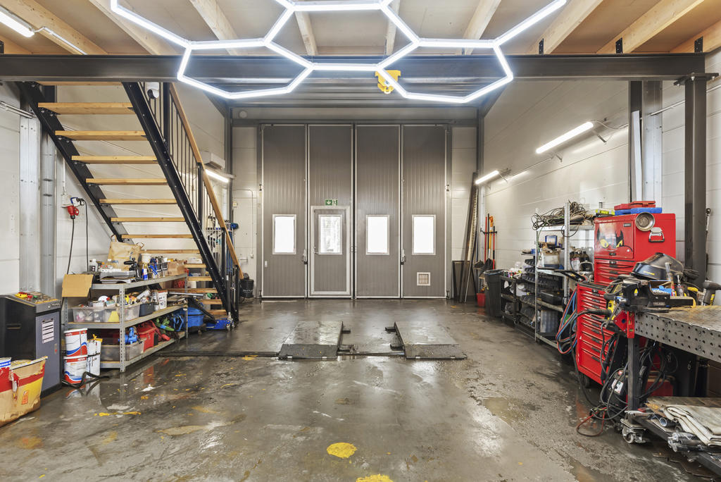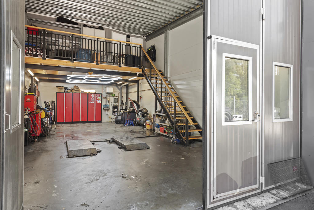 Lokalen har flexibla ytor som enkelt kan anpassas till dina behov, kommunalt vatten och avlopp med oljeavskiljare samt möjlighet till fiber för en modern och uppkopplad arbetsplats. Lokalen används idag som verkstad med inredd entresolvåning om ca 33 kvadrat med ett fint laminatgolv där du hittar ett kontor med trinettkök och plats för skrivbord och även en stor soffhörna. Här uppe finns också en toalett.