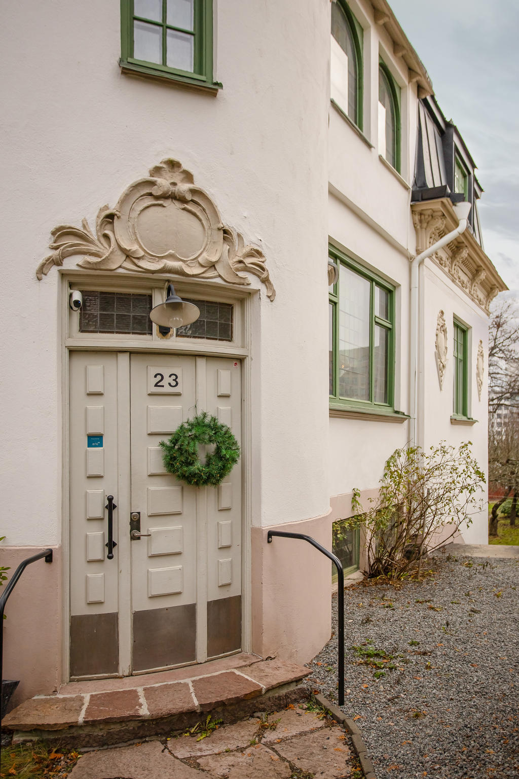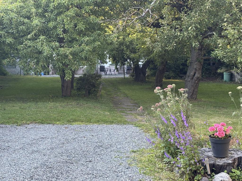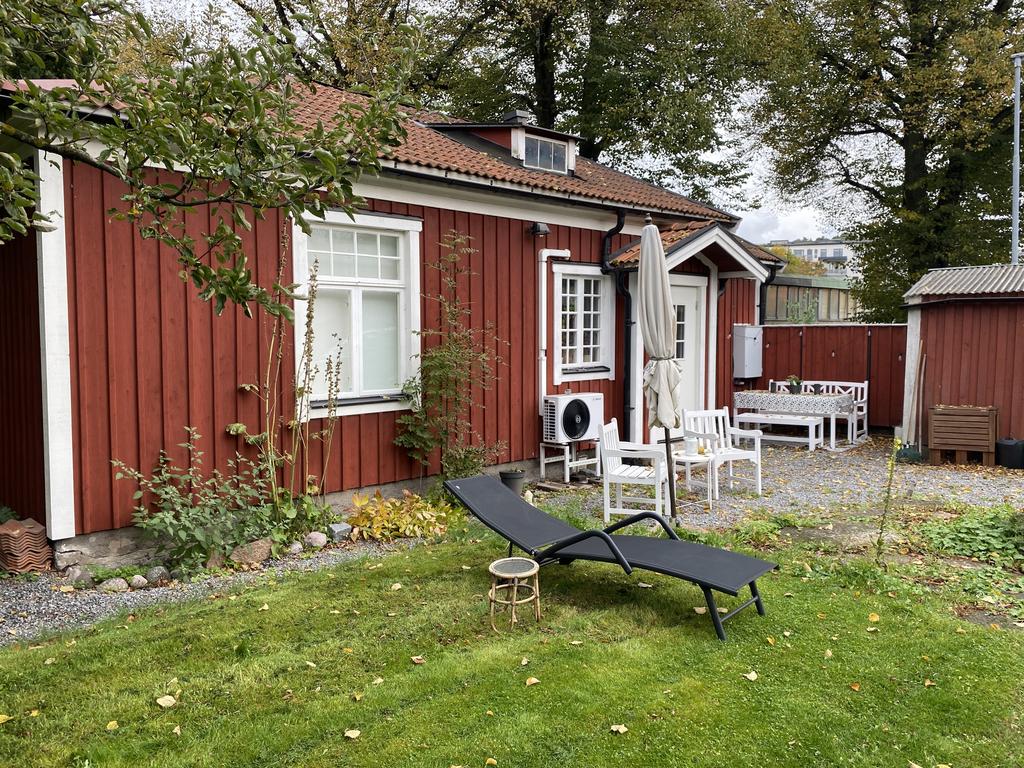 Utanför huset möts du av en ljuvlig, uppvuxen trädgård med fruktträd, blommande buskar och flera små sittplatser där man gärna slår sig ner under sommarhalvåret. En miljö som ger fastigheten en alldeles egen själ och karaktär.