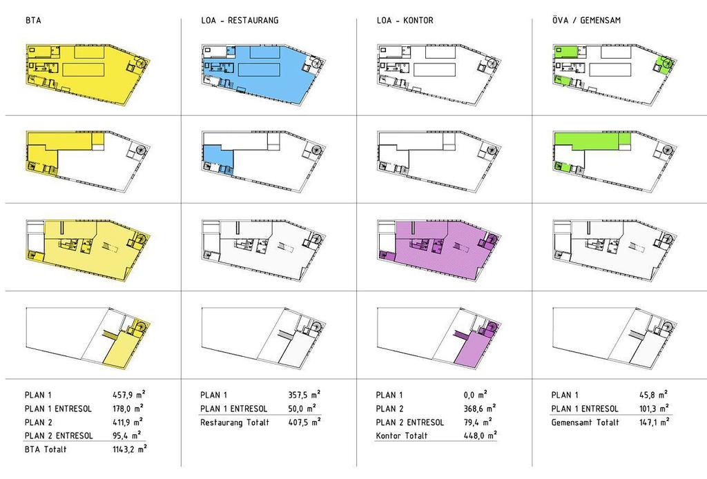 - Restauranglokal, plan 1: Totalt ca 408 kvm fördelat på 358 kvm + entresolplan om ca 50 kvm