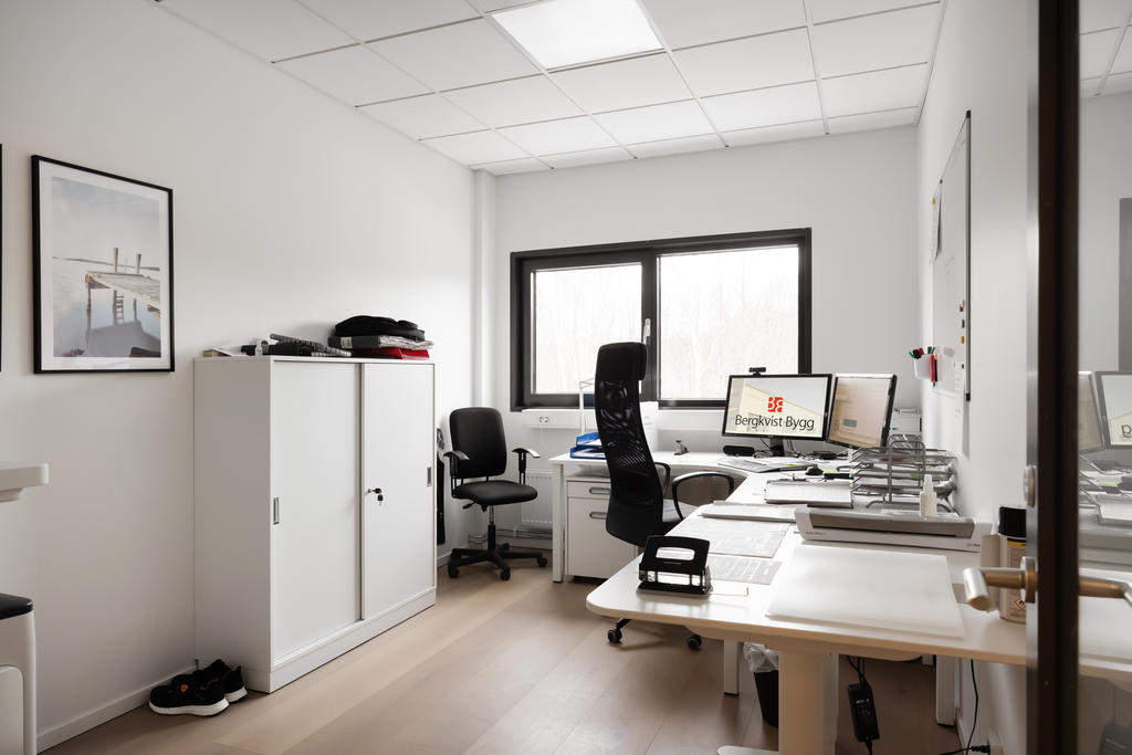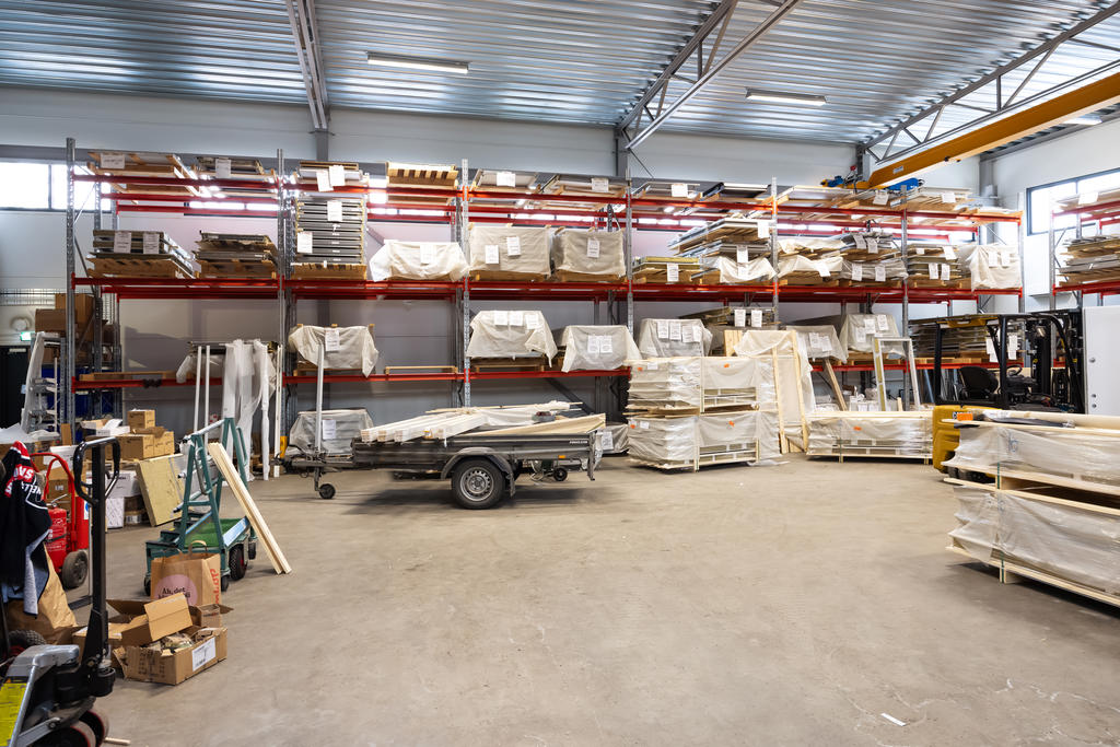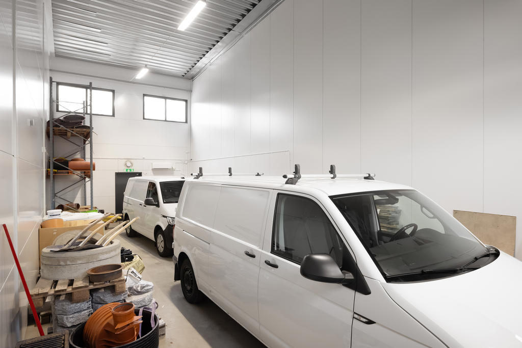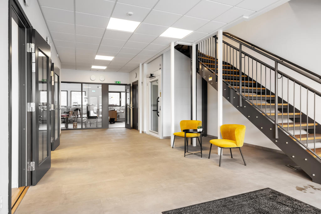 Modern industrifastighet med stora lagerdelar och fräscha kontorsytor