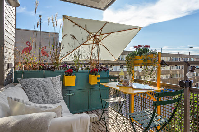 Underbar gaveltrea med solig balkong!