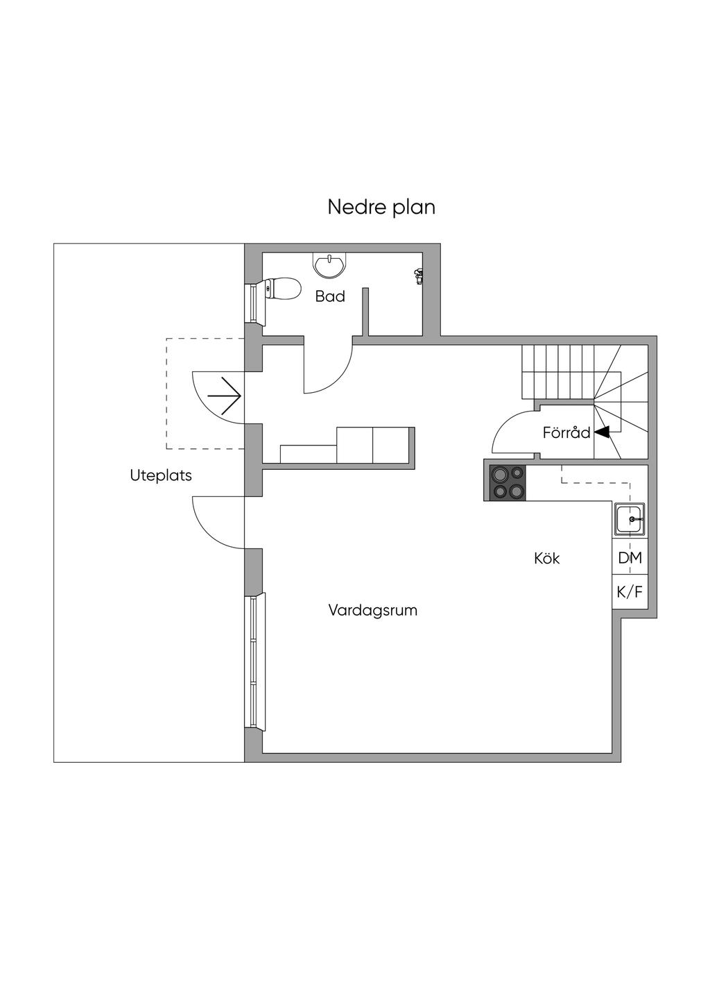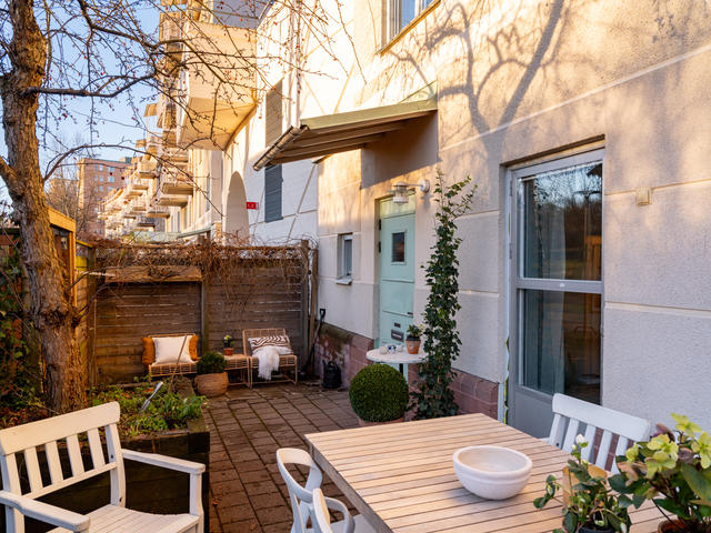 Etage med radhuskänsla, 35 kvm uteplats i söder mot koloniträdgårdarna i Tanto!