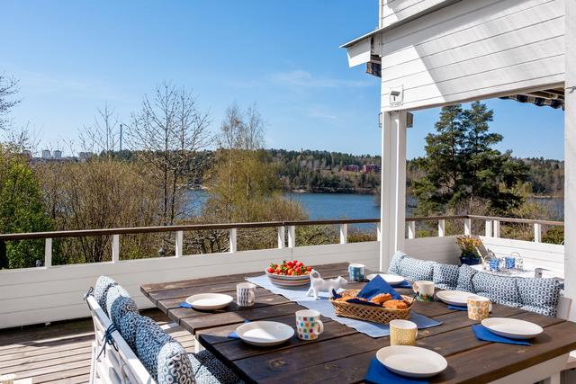 Gavelradhus med sjöutsikt och luftig rymlig tomt i solläge.