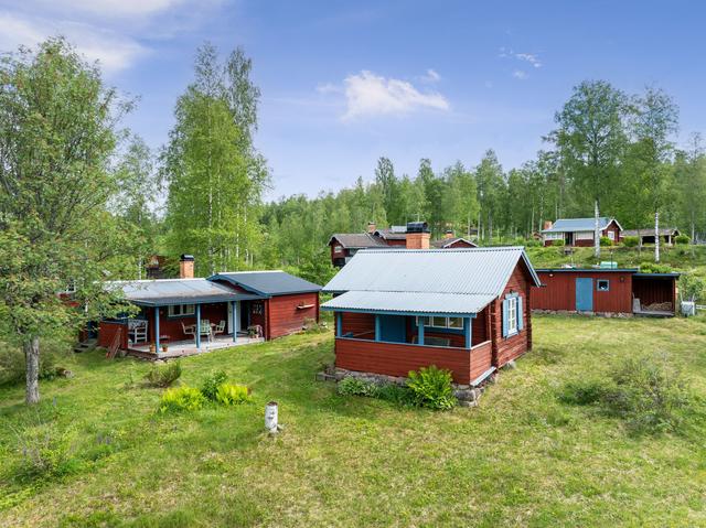Charmigt fritidshus med flera stugor och sjöutsikt samt bad och båtplats intill.