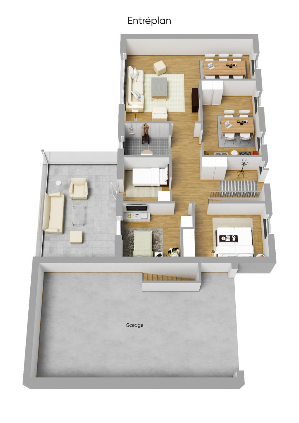 1-plansvilla med inredd källare, uterum och vidbyggt garage