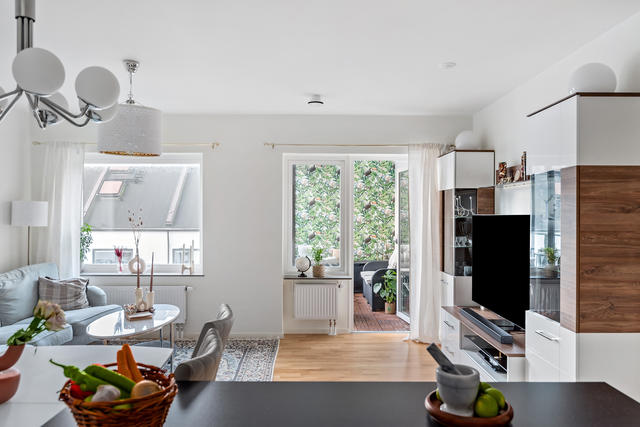Högt belägen trerummare med inglasad balkong och utsikt över innergården