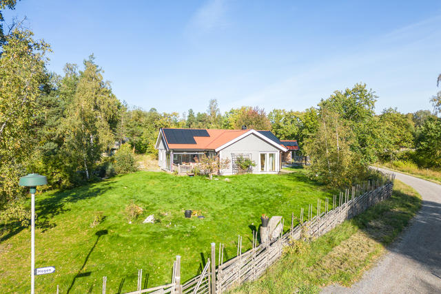 Ytterst tilltalande enplanshus , dubbelcarport med vinterbonat gäst/arbetsrum och en friggebod.