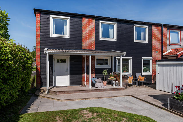 Stort gavelradhus som rymmer den stora familjen! Fin insynsskyddad trädgård.