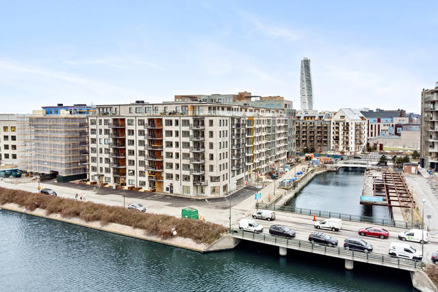 Stor trerummare med dubbla balkonger och kanalutsikt