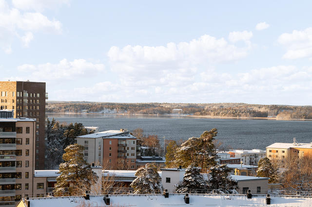 Välplanerad 4:a högst upp i huset med stor inglasad balkong och fantastisk sjöutsikt