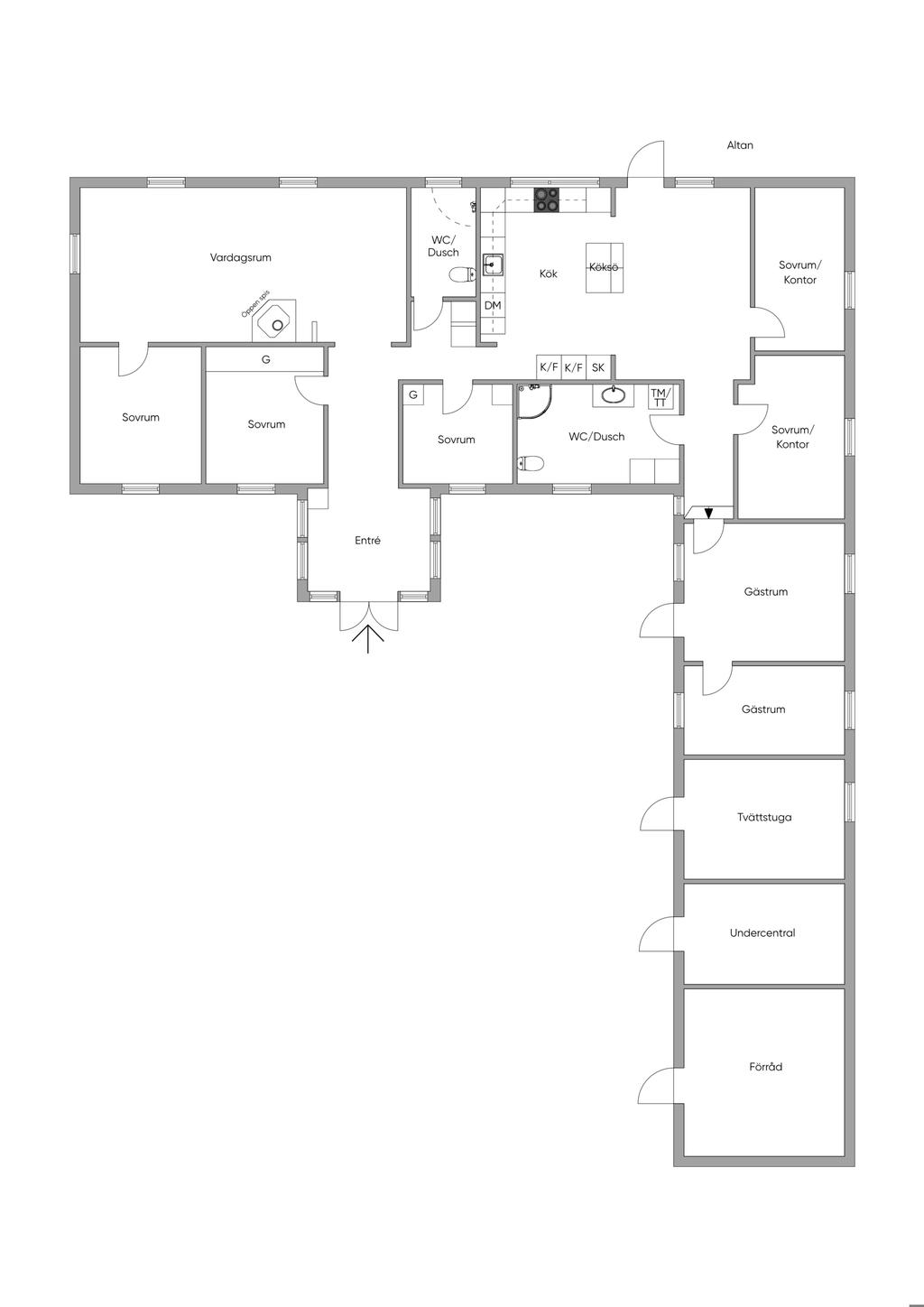 Alternativ planlösning om man öppnar upp till allrum och sovrum i längan. Öppnar man även (eller istället) upp till befintlig tvättstuga kommer man åt vatten och avlopp för att bygga kök och badrum och skapar därmed en fullt utrustad lägenhet.,