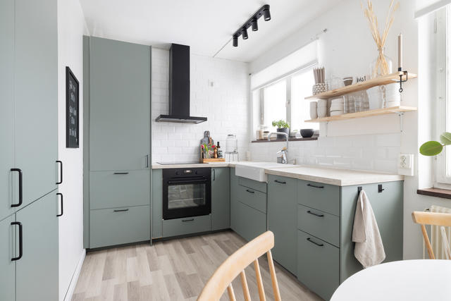 Topprenoverad gavel 3a högst upp i huset med matbutik och buss runt hörnet.