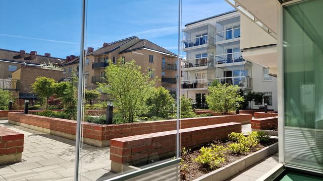 Fin lägenhet på första våningen med inglasad uteplats mot innergården