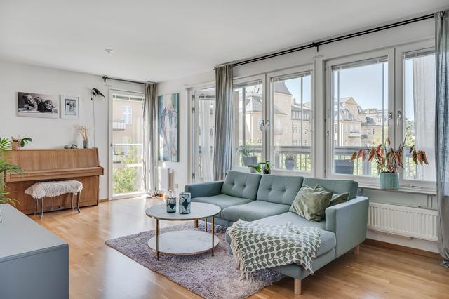 Modern trea med dubbla balkonger och ljusinsläpp via tre väderstreck!