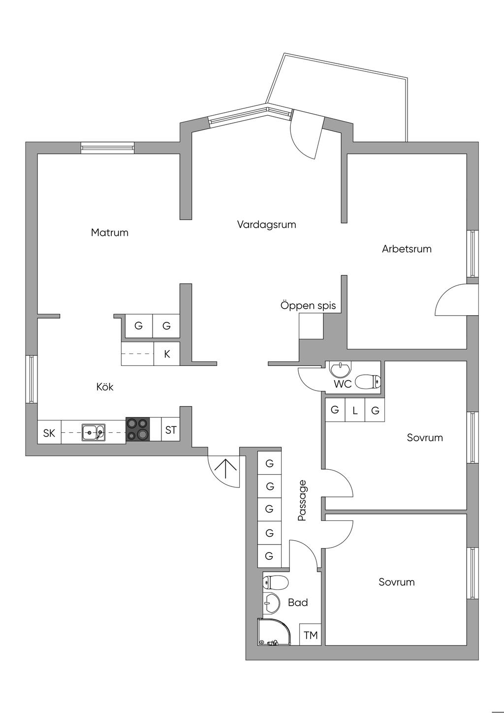 Gavellägenhet på 108 kvm med fem rum och kök. Öppen spis
