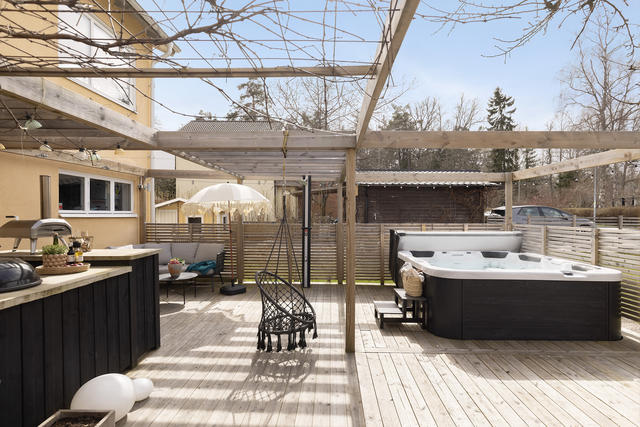 Närhet till Långsjön med 3 balkonger och underbar terrass med utespa och utekök