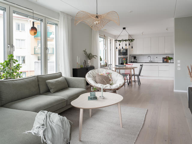 Ljus gaveltrea med två balkonger i stabil och omtyckt förening!