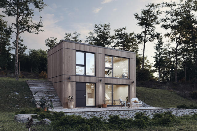 Nybyggt studiohus med skog runt sig och braskamin.