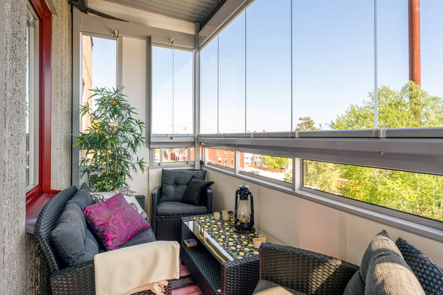 Högst upp i huset med inglasad balkong på Utövägen 12!