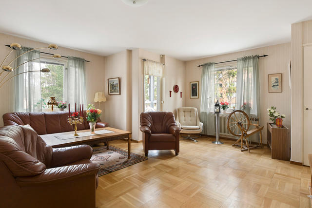 Gaveltrea med inglasad balkong i mycket omtyckta Stigslund.