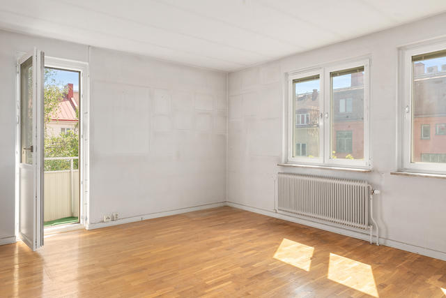 Ljus gavellägenhet med högt läge i huset och dubbla balkonger. Renoveringsobjekt med stor potential.
