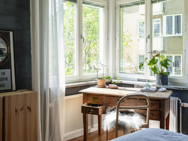 Gaveltrea med fantastiskt ljusinläpp, eldningsbar öppenspis och solig balkong!